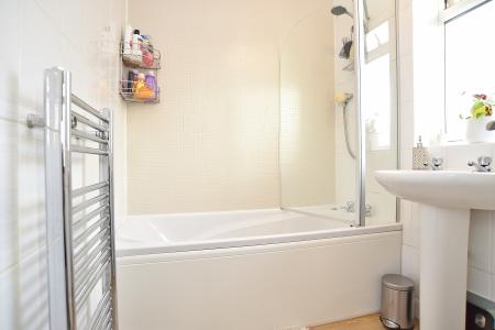 Bath with shower over and screen, low-flush WC and pedestal washbasin. Chrome heated towel rail. Window to side elevation.