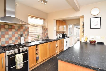 Range of wall and base units with working services having inset sink. Breakfast bar. Gas oven and grill with extractor fan over. Plumbing and spaces for washing machine, tumble dryer and dishwasher. Window to side elevation and rear access door.