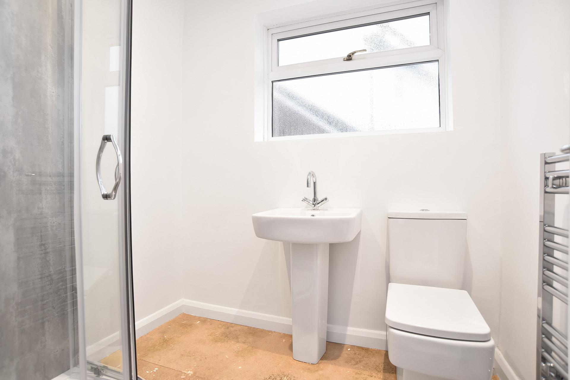 Fitted with a stylish corner shower, low flush WC, wash basin and extractor fan. Window to side elevation.