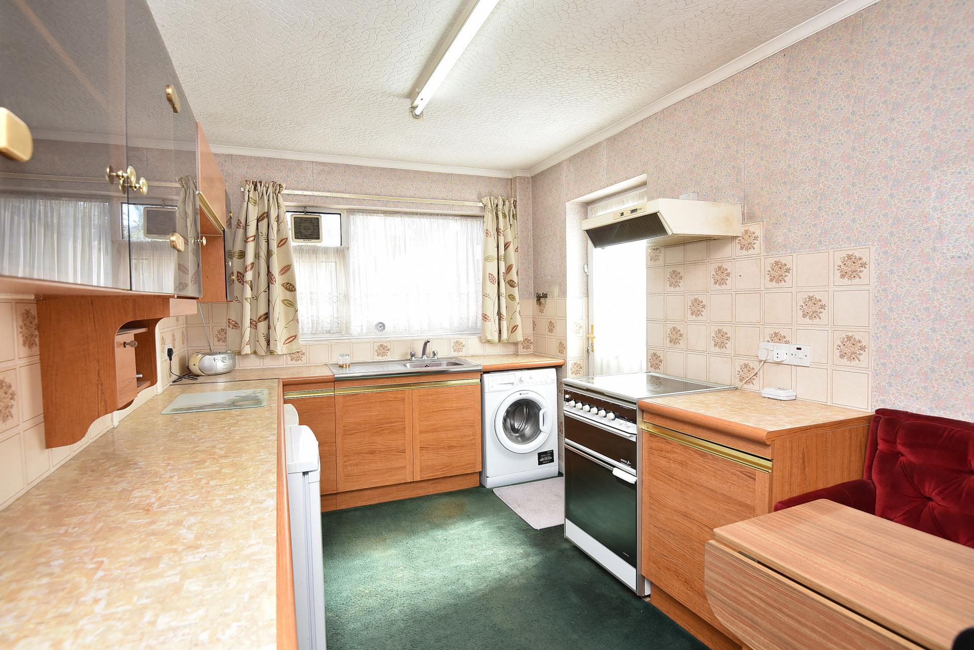 The fitted kitchen with a range of wall and base units with electric cooker, space for appliances. Window to rear overlooking the garden and door to side.