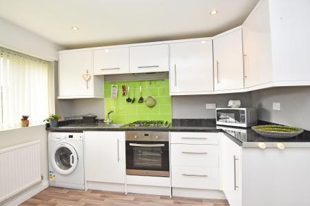 With a range of modern wall and base units, worktops and breakfast bar. Gas hob with extractor hood above and integrated oven below. Space and plumbing for washing machine and fridge / freezer. Window to front.