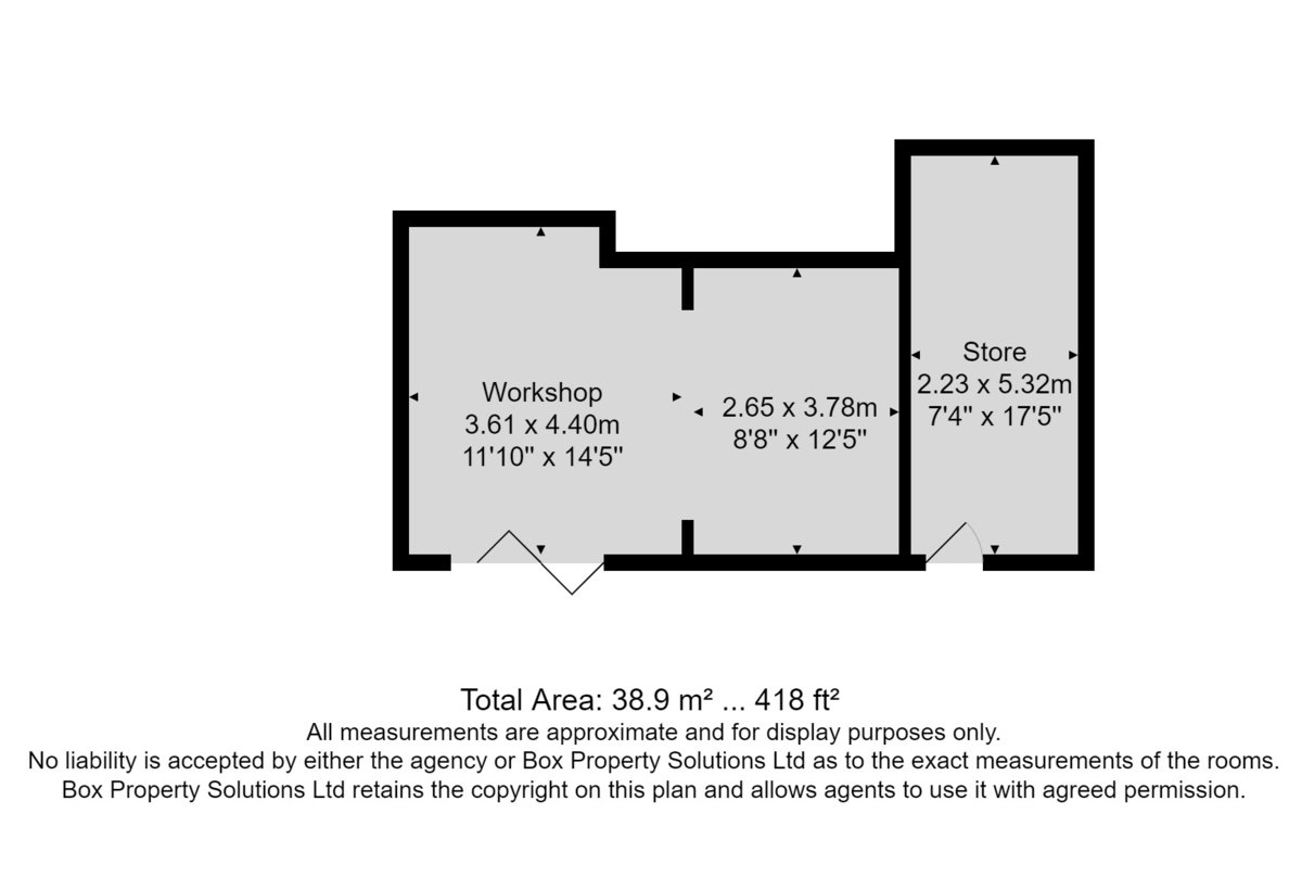 The main part of the property comprises a two story building plus a small single story projection to the rear. It is divided into two rooms with a large opening between them. Access is available via a pedestrian door within a large sliding door to the front of the larger left-hand side room. A ceiling hatch into the upper story has been boarded over and no other internal access to the loft is currently available. There is also a single story lean-to to the side. At the side of the property there is a gravel yard