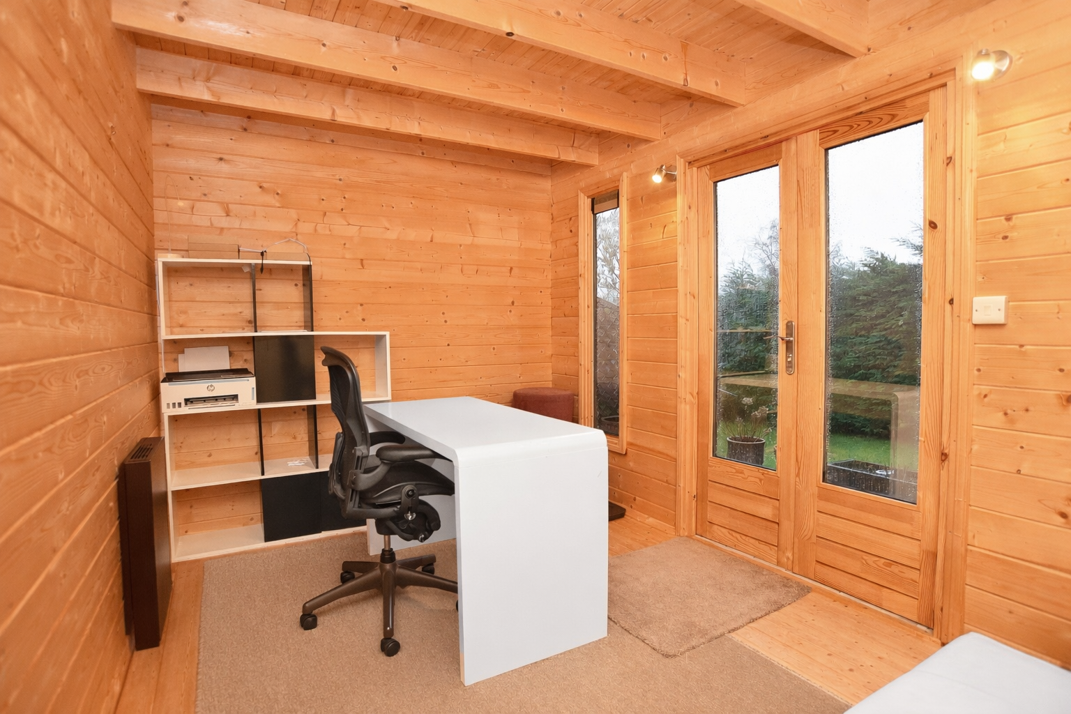 A timber-built garden office with light and power, providing an excellent work-from-home space.