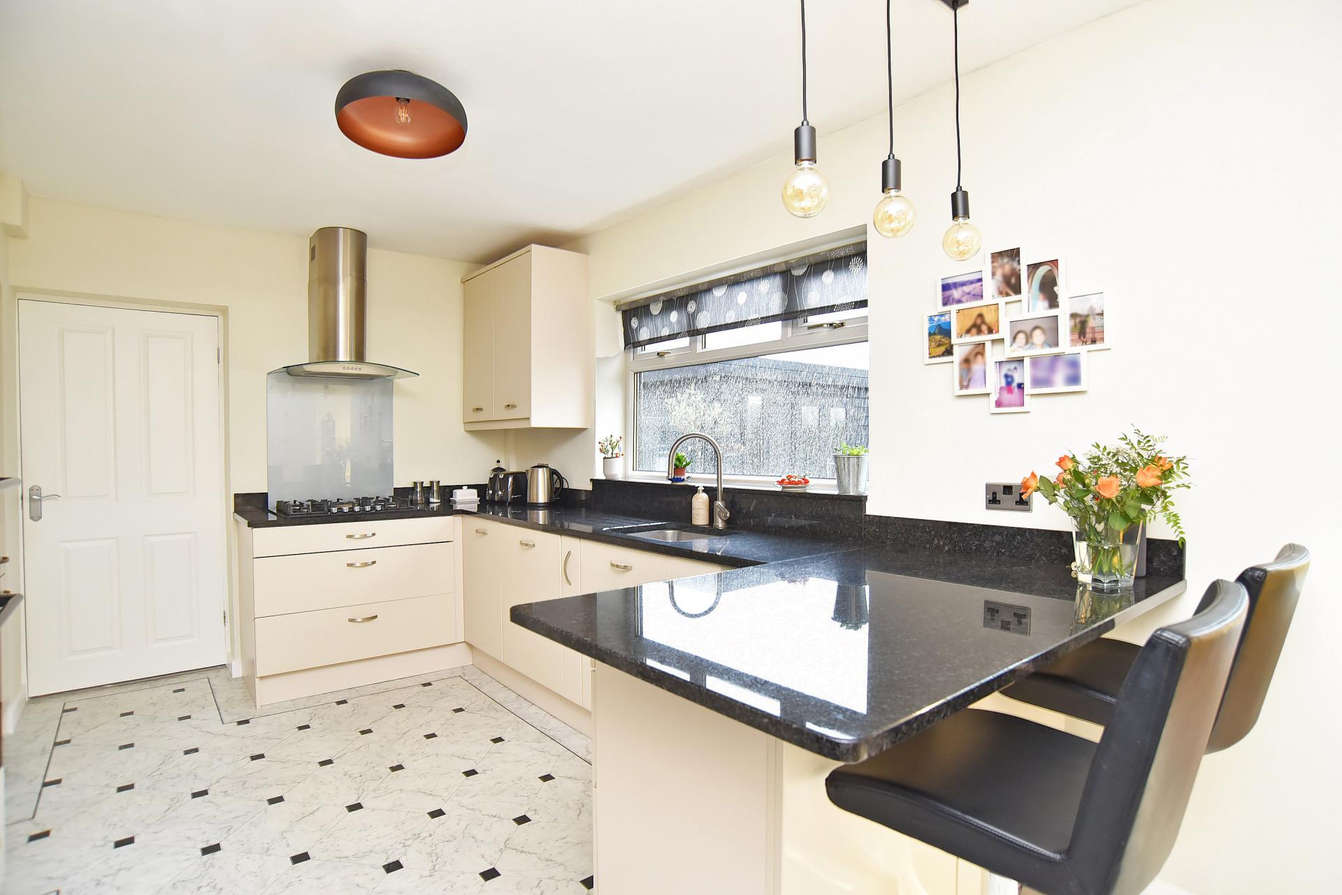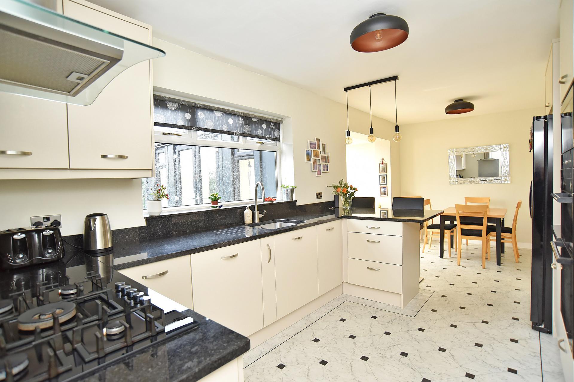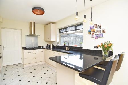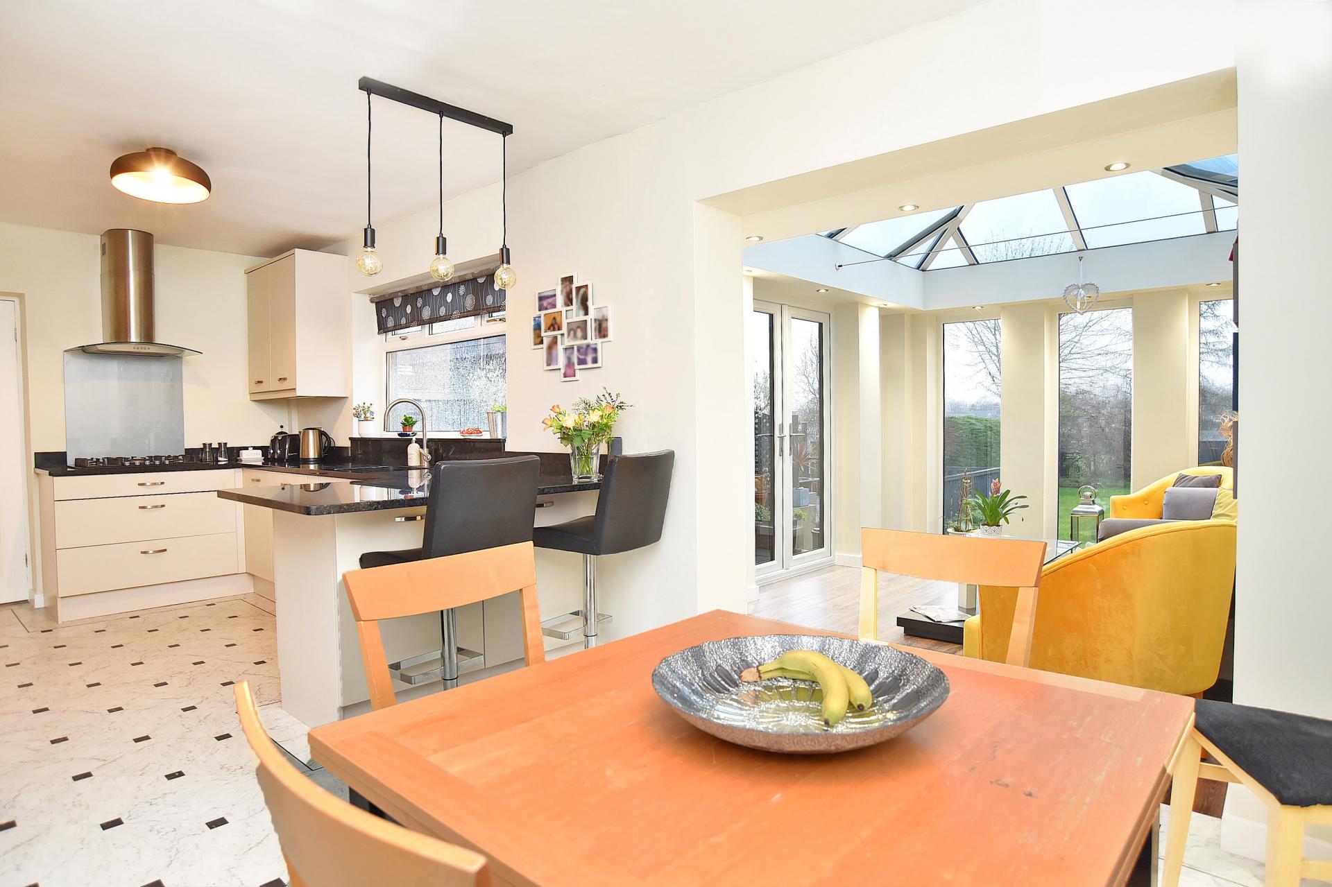 A stunning L-shaped open-plan kitchen, dining and living space with glazed doors and windows overlooking the garden. The kitchen comprises a range of stylish modern units with granite worktops and breakfast bar, with integrated appliances including gas hob, double oven, microwave and dishwasher.
