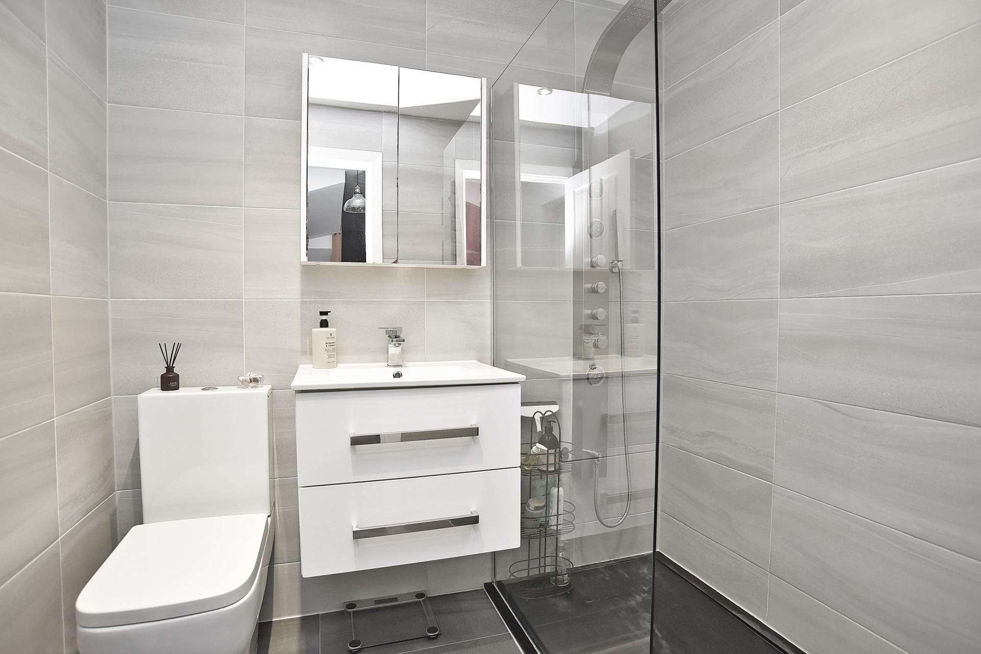 With WC, washbasin and shower. Heated towel rail.