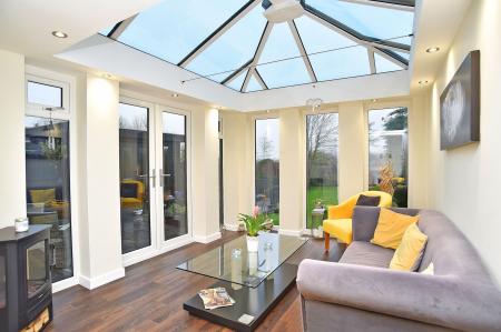 A stunning L-shaped open-plan kitchen, dining and living space with glazed doors and windows overlooking the garden. The kitchen comprises a range of stylish modern units with granite worktops and breakfast bar, with integrated appliances including gas hob, double oven, microwave and dishwasher.