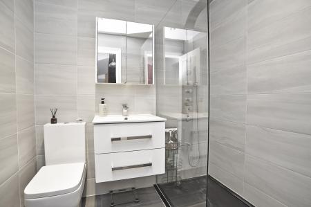 A modern white suite comprising WC, washbasin set within a vanity unit and large walk-in shower. Heated towel rail.
