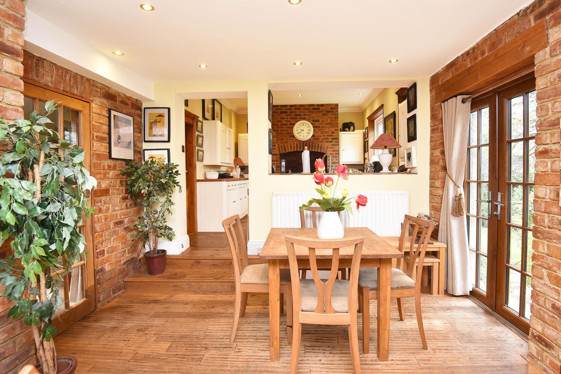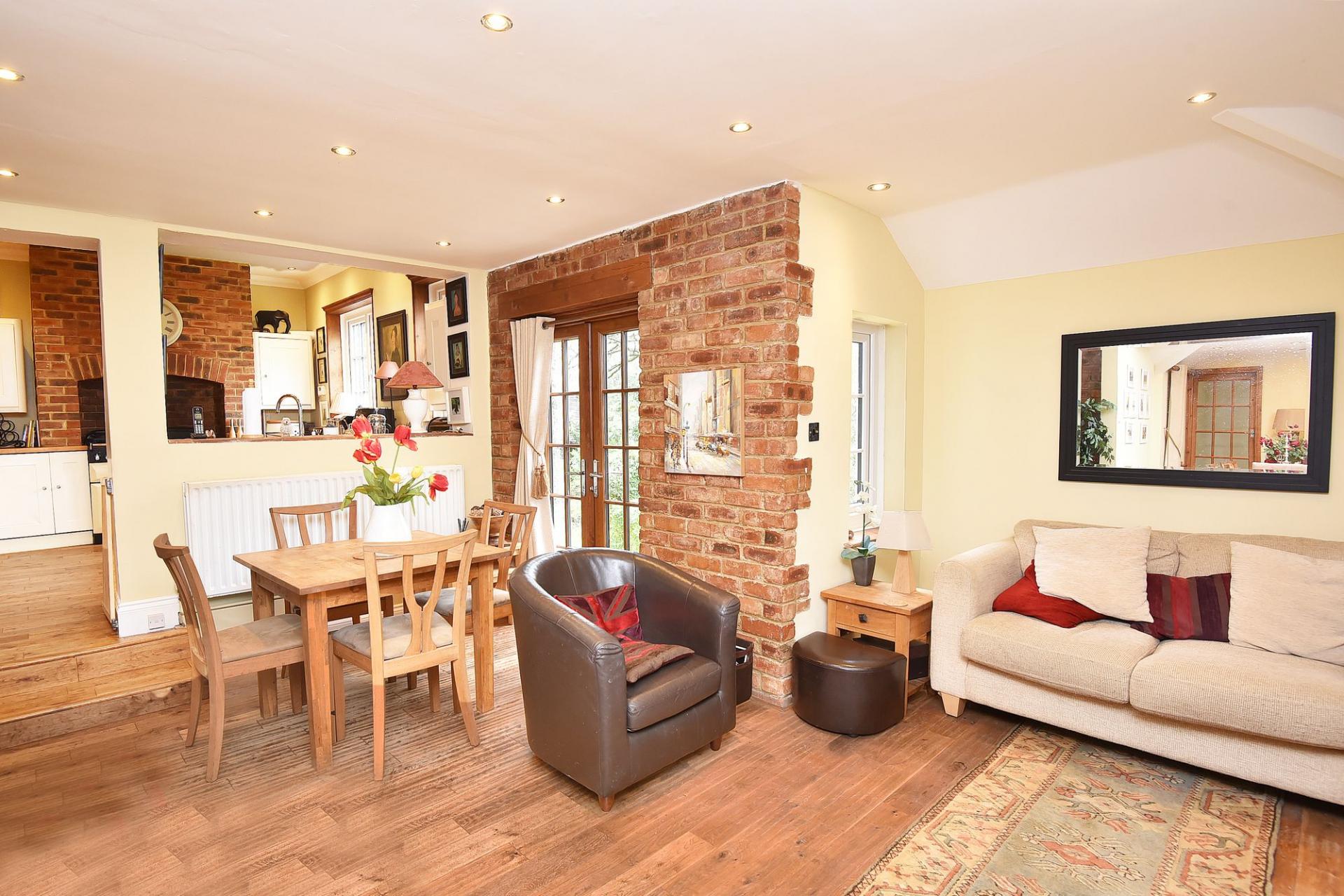 A stunning open-plan kitchen and living space with sitting and dining areas and glazed patio doors leading to the garden. The kitchen comprises a range of fitted units with space for a range cooker, integrated fridge and dishwasher.