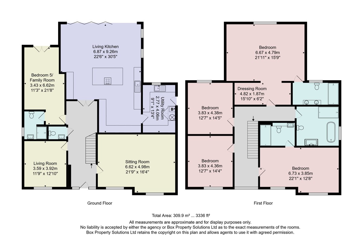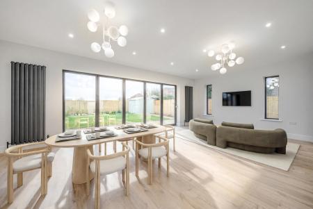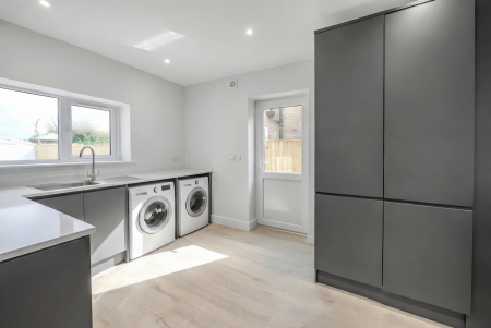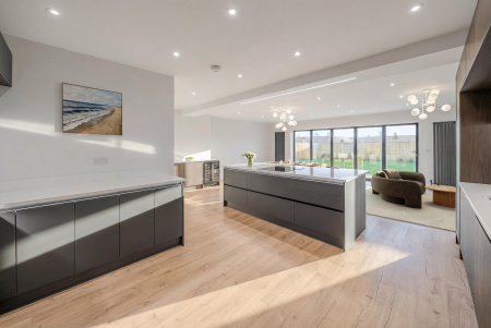 At the heart of the home lies a spectacular open-plan living, dining and kitchen area – a magnificent space ideal for both everyday life and entertaining on a grand scale. Here, bespoke cabinetry, granite work surfaces, and a large breakfast island complement a range of premium integrated appliances. Expansive bi-fold doors flood the space with natural light and open directly onto the paved terrace, creating a seamless connection between house and garden. A well-equipped utility room provides further convenience and external access.