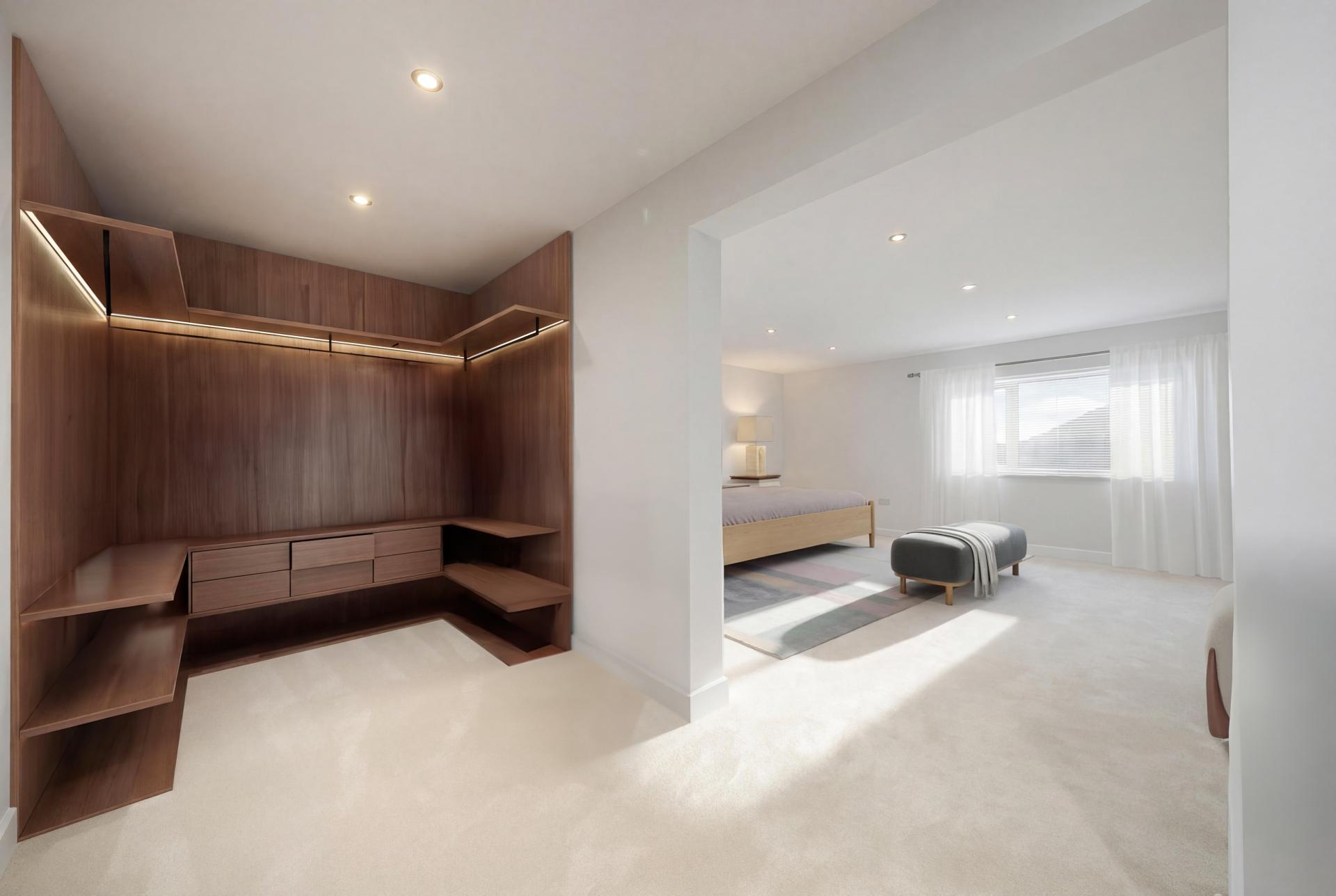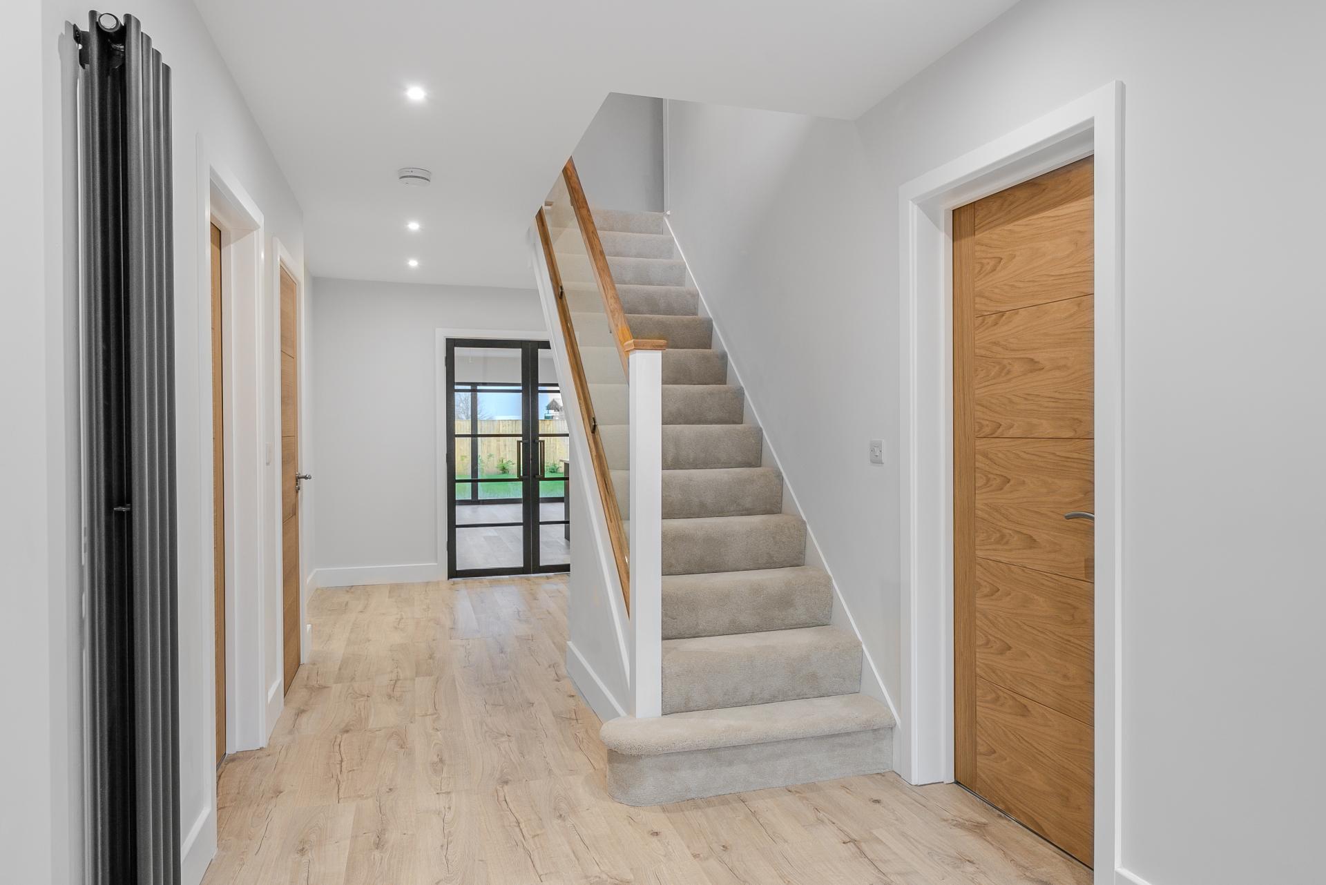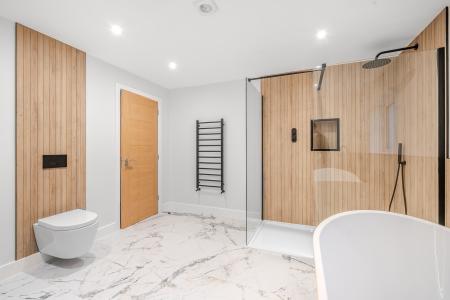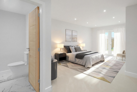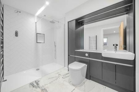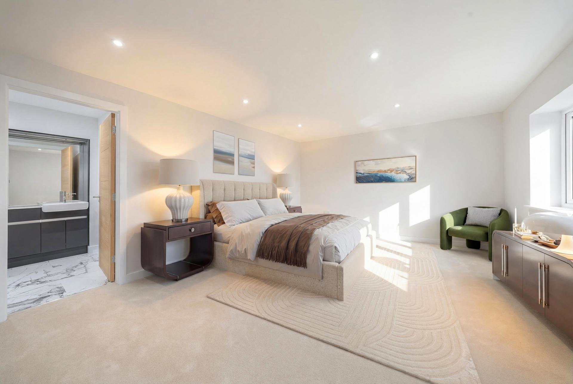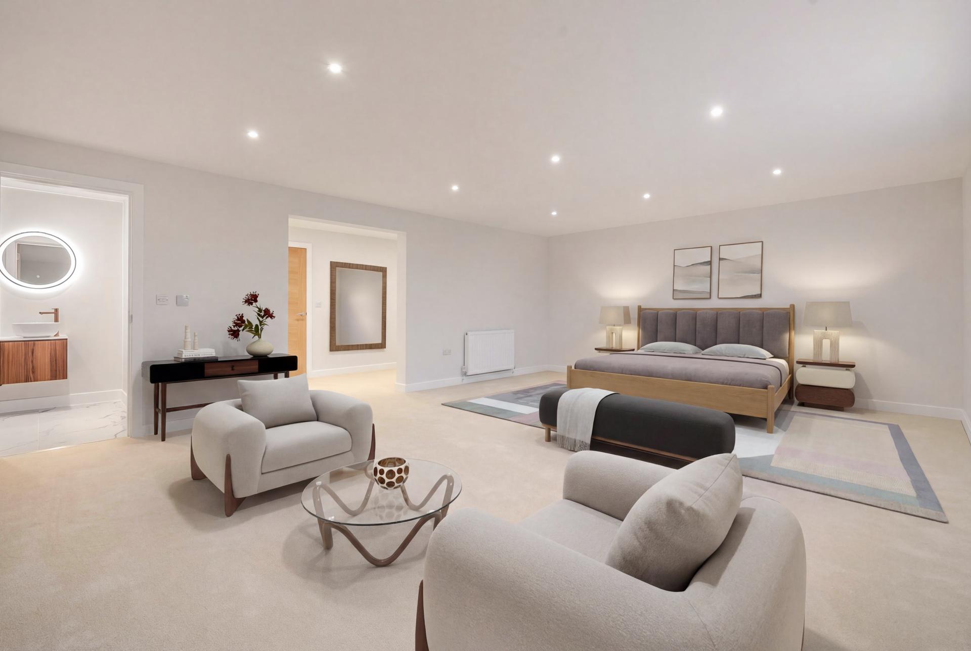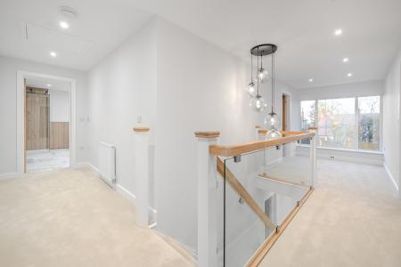 To the first floor, an elegant glass balustrade staircase rises to an open galleried landing, leading to four beautifully appointed bedrooms. The principal suite offers a serene private retreat with a dressing area and a luxurious en-suite shower room, featuring a double vanity, illuminated mirrors, and a walk-in rainfall shower. Bedroom two also benefits from a contemporary en-suite shower room, while the family bathroom exudes boutique-hotel sophistication, complete with a freestanding bath, walk-in shower, and bespoke vanity unit.