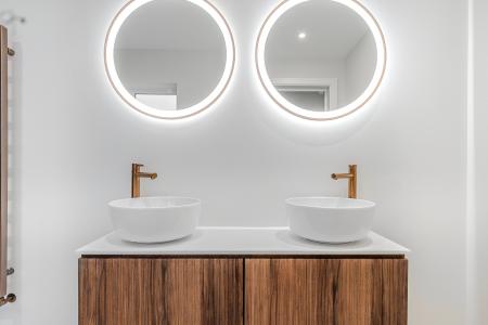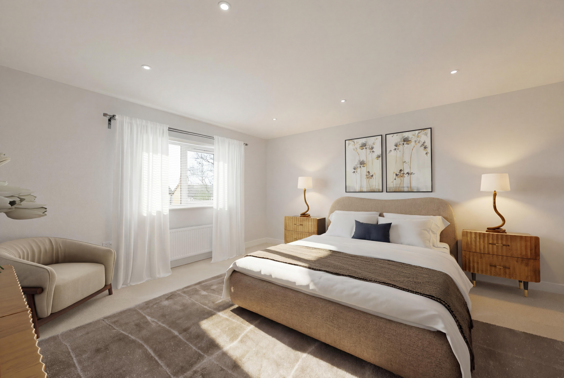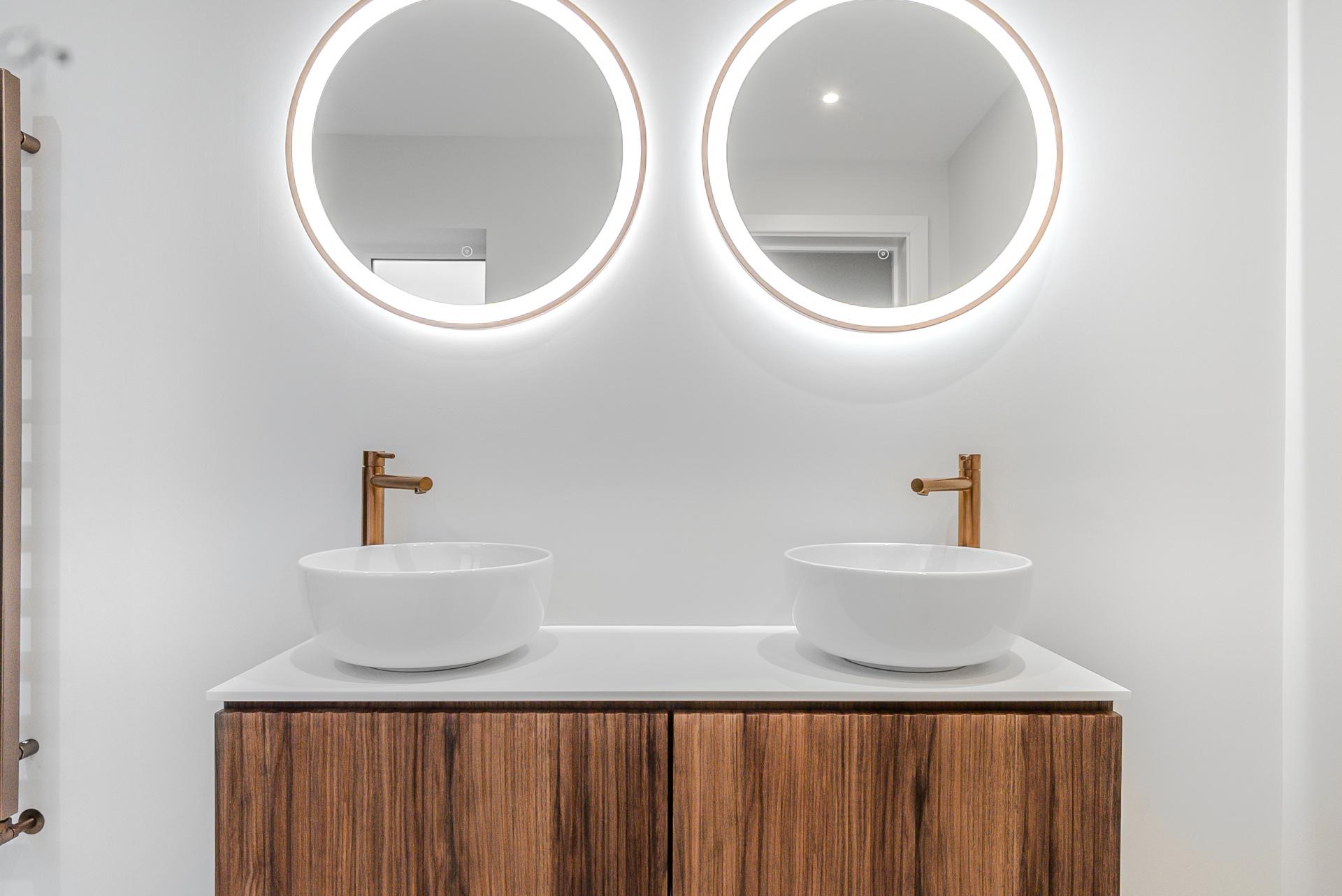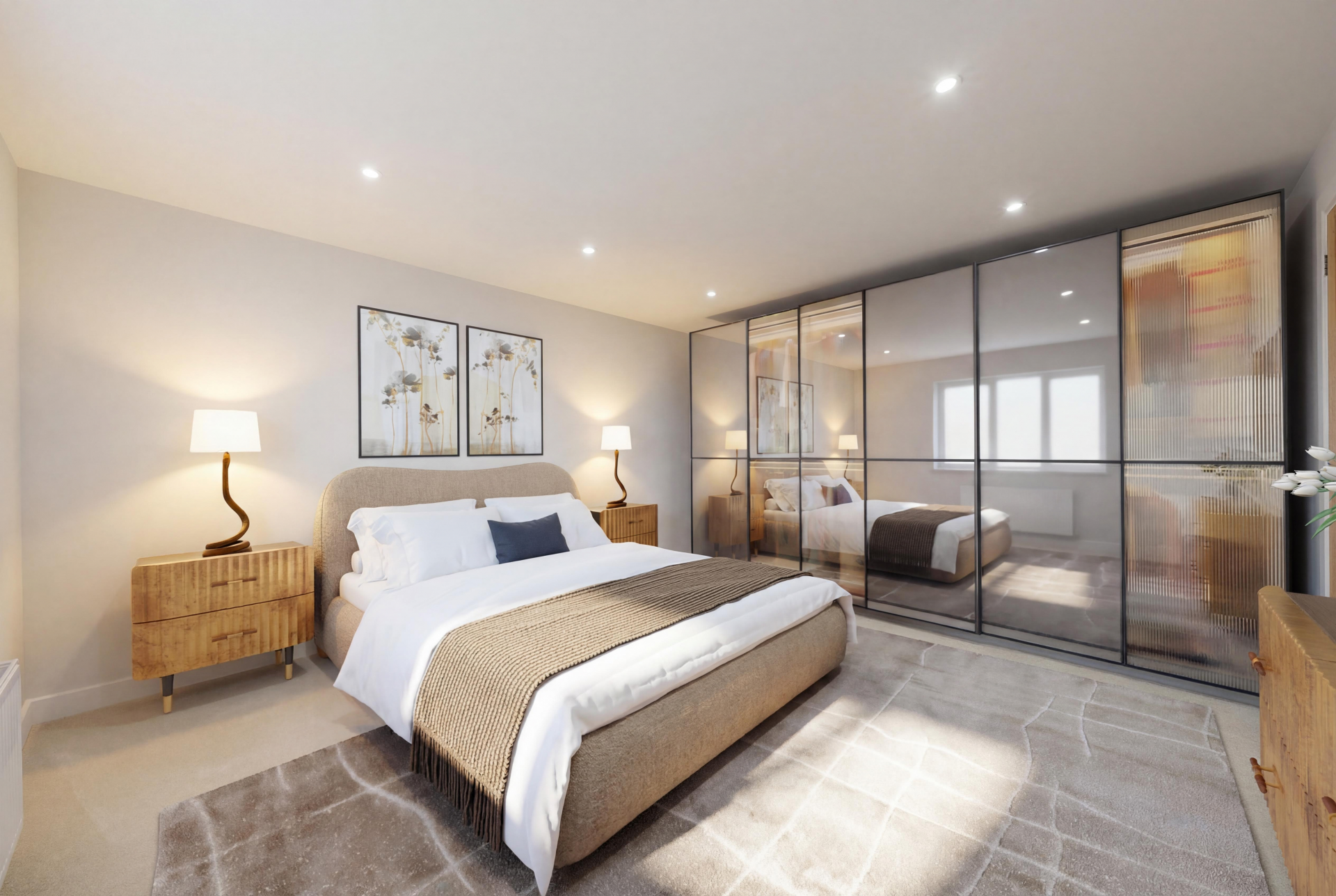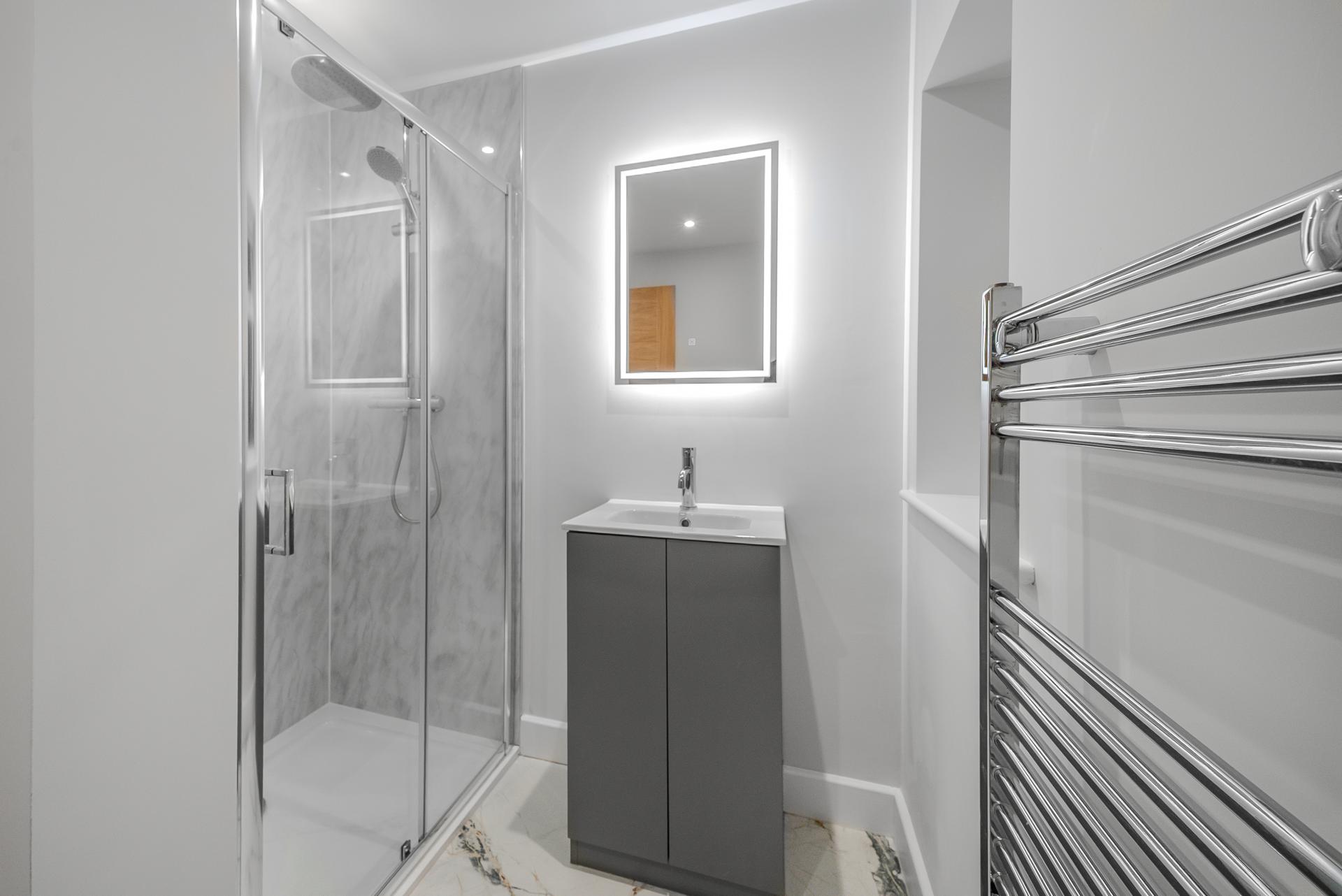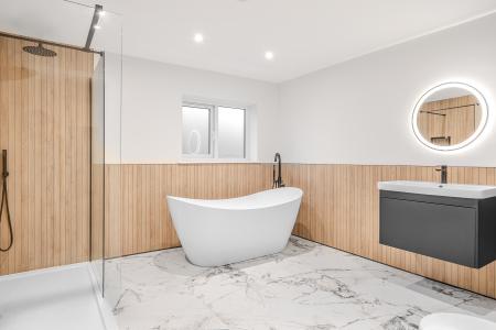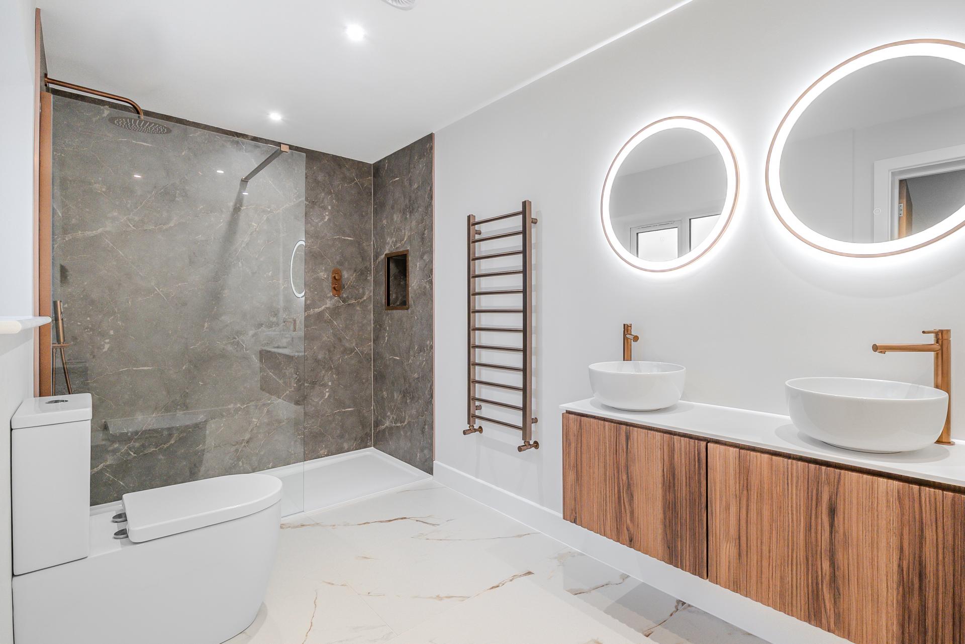 To the first floor, an elegant glass balustrade staircase rises to an open galleried landing, leading to four beautifully appointed bedrooms. The principal suite offers a serene private retreat with a dressing area and a luxurious en-suite shower room, featuring a double vanity, illuminated mirrors, and a walk-in rainfall shower. Bedroom two also benefits from a contemporary en-suite shower room, while the family bathroom exudes boutique-hotel sophistication, complete with a freestanding bath, walk-in shower, and bespoke vanity unit.