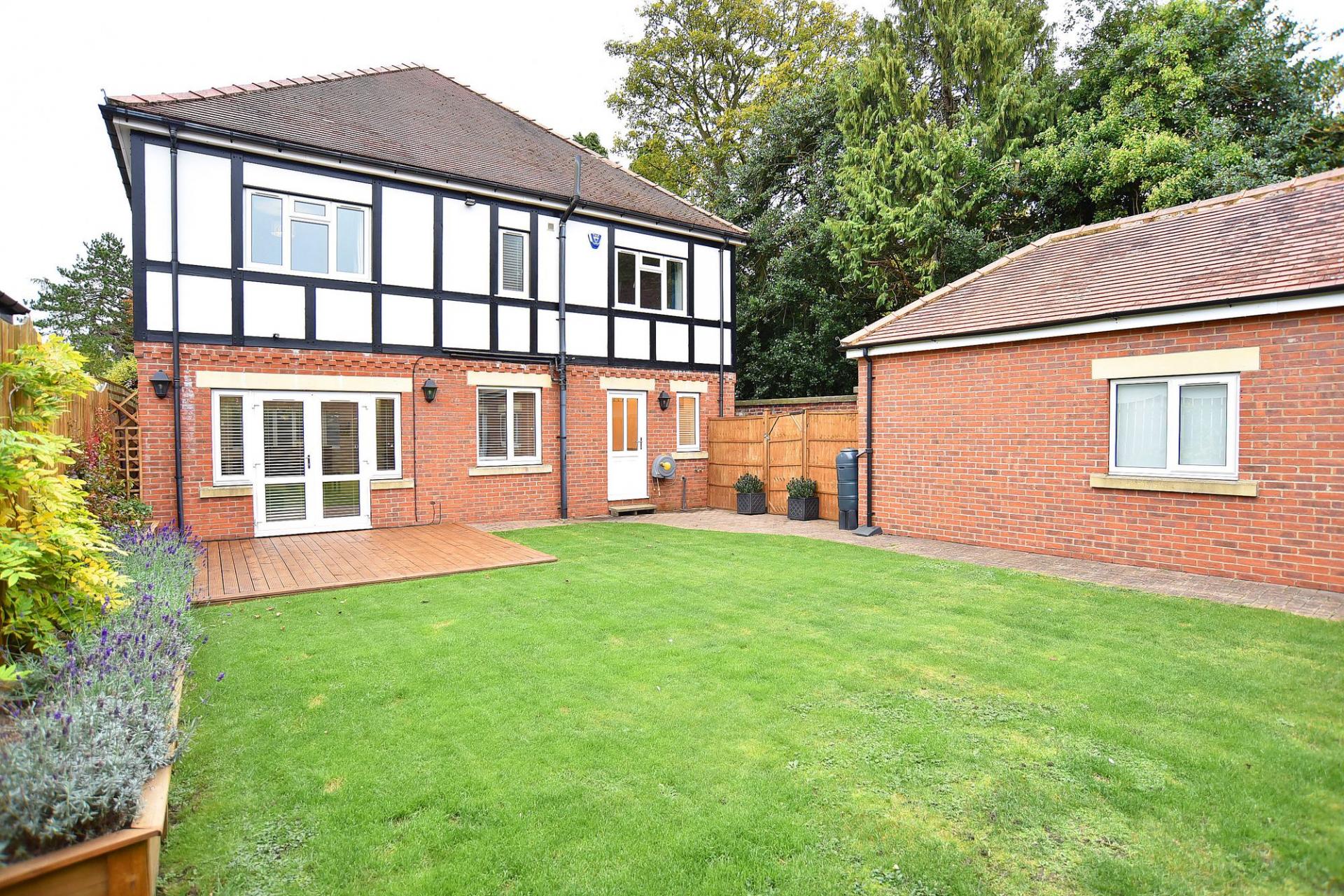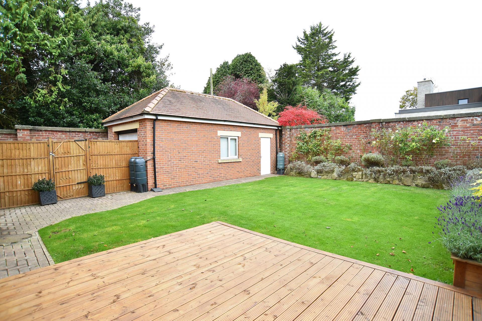 Outside, the property is approached via electric wrought-iron gates, opening onto a large brick-paved driveway providing extensive parking and leading to a detached garage (29'1'' x 11'5''). To the rear, there is a beautifully enclosed garden with a neat lawn, mature borders, and a timber decked terrace, offering a delightful setting for outdoor dining and family gatherings.