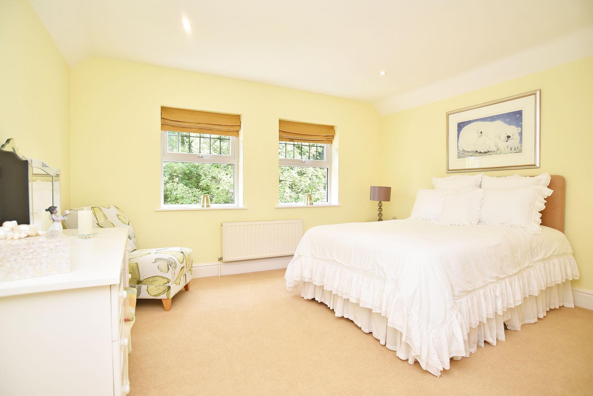 A large double bedroom with fitted wardrobes and dressing area.