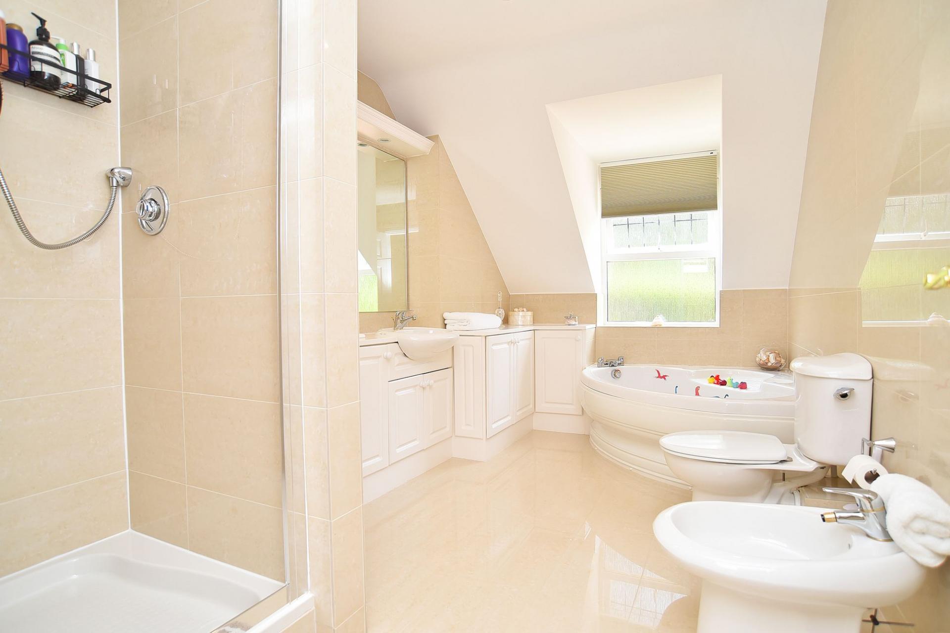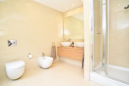 A modern white suite comprising WC, twin washbasins set atop a vanity unit, bidet and shower. Tiled walls and floor. Heated towel rail.