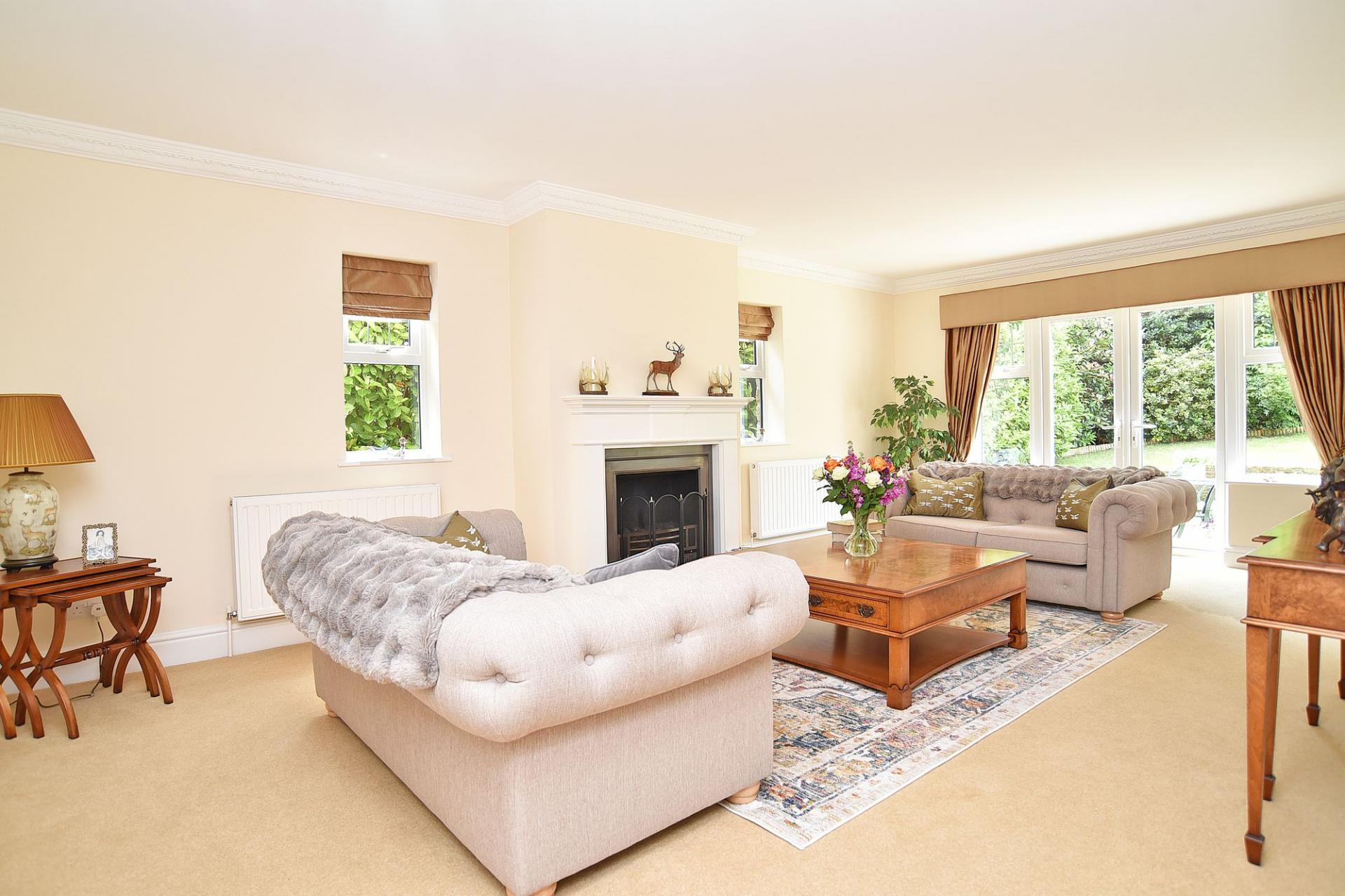 A spacious reception room with glazed doors leading to the garden and attractive fireplace with living-flame gas fire.
