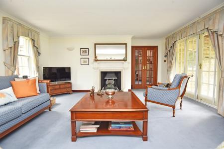 A large reception room with glazed doors leading to a veranda at the front of the property. Attractive fireplace with living-flame gas fire.