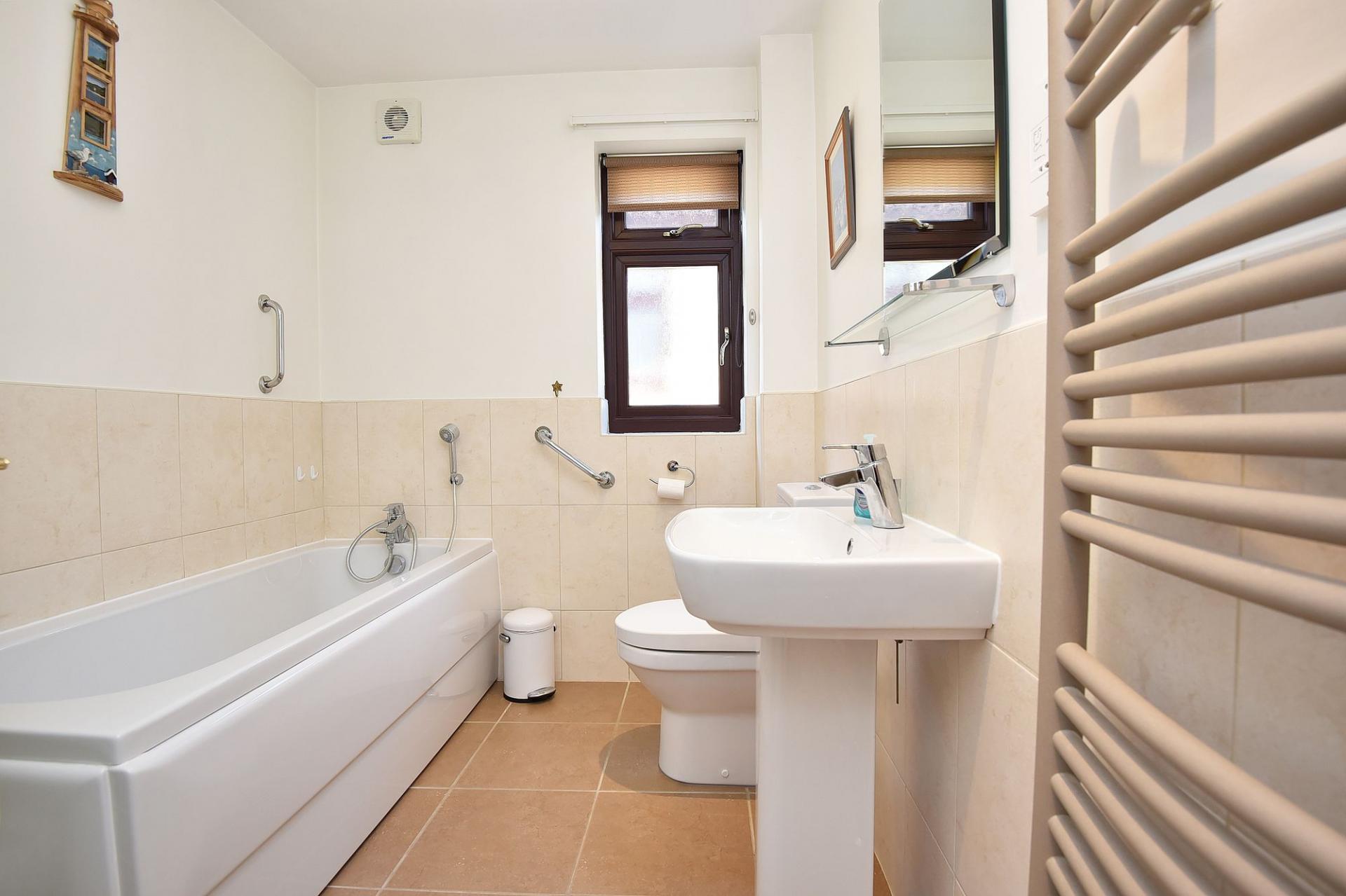 Modern white suite comprising low-flush WC, washbasin, bath and corner shower cubicle with sliding glass door. Tiling to walls and floor, heated towel rail and window to side.