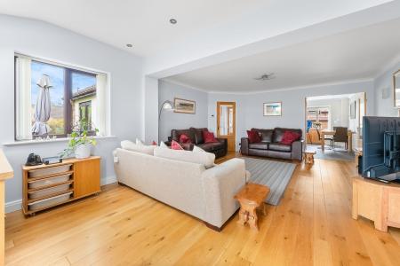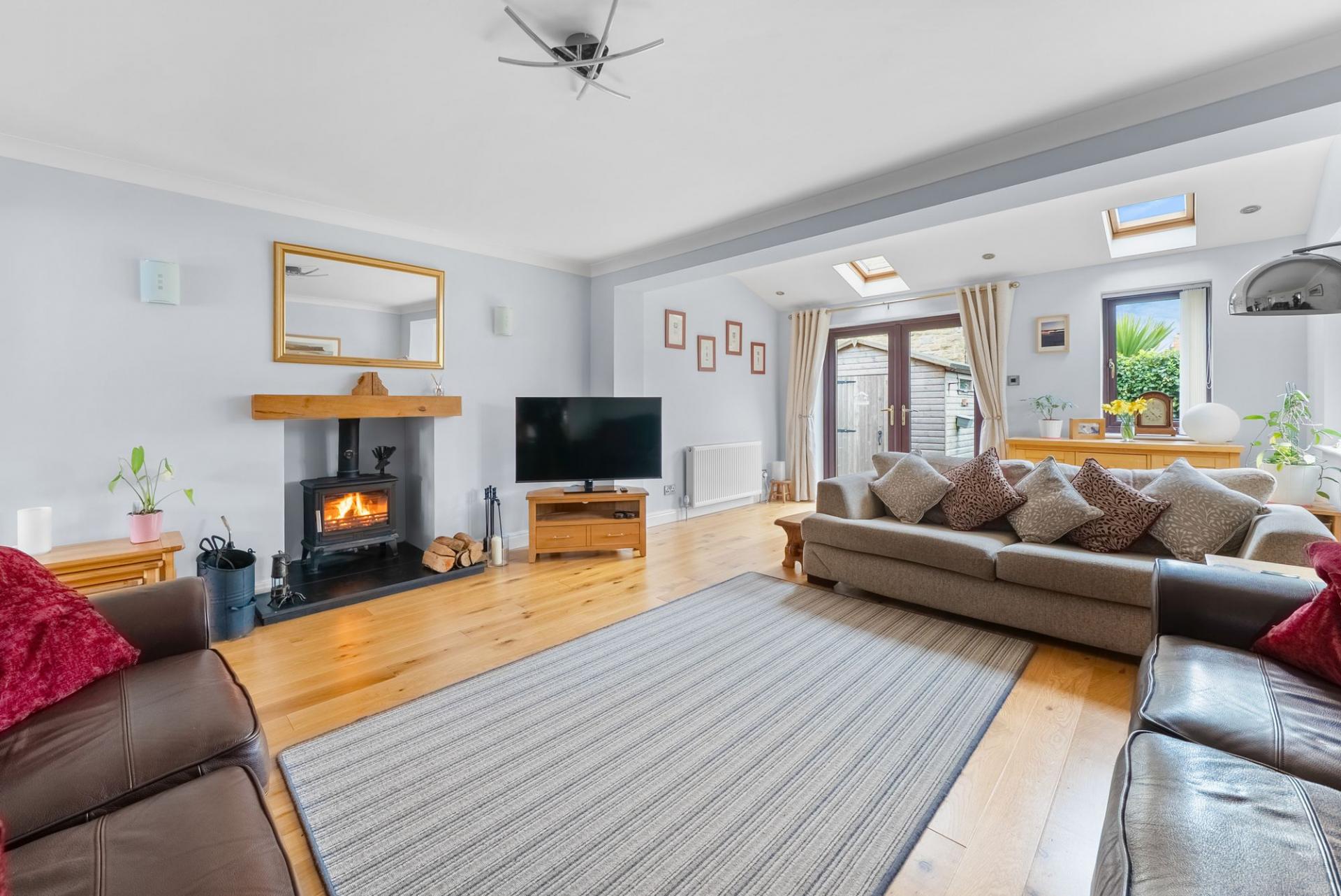 Glazed double doors lead from the dining kitchen to the impressive extended sitting room, which features oak flooring, a log-burning /solid fuel stove and a vaulted ceiling with Velux windows creating a wonderfully light and airy living space. French doors open directly onto the rear garden.