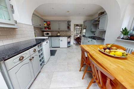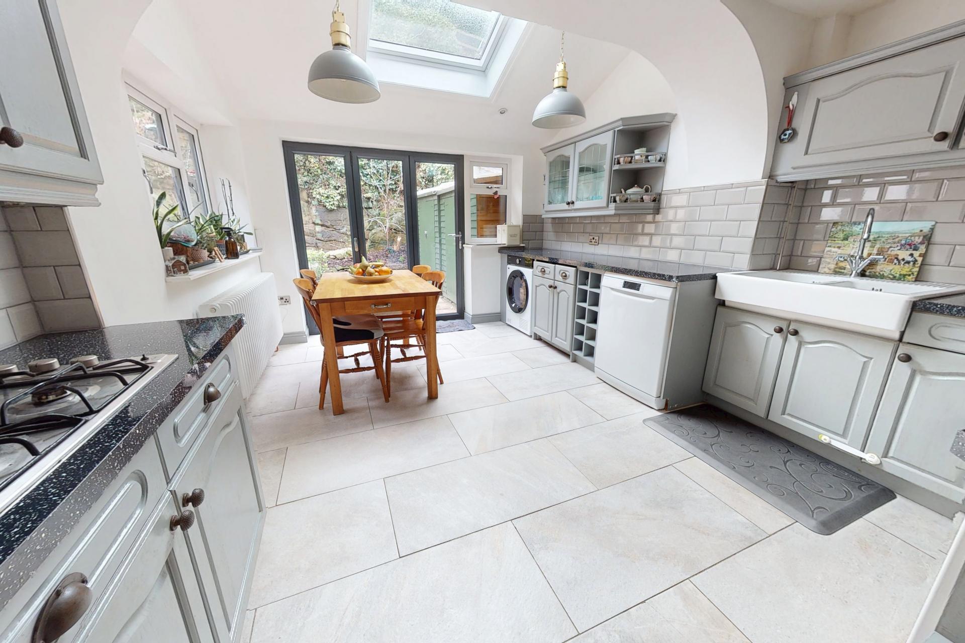 With range of wall and base units and work surfaces with Belfast sink. Four-ring gas hob with extractor hood above. Integrated electric double oven and space and plumbing for appliances. Dining area and glazed lightweight titanium bi-folding doors lead to the garden. Under-floor heating with timer.