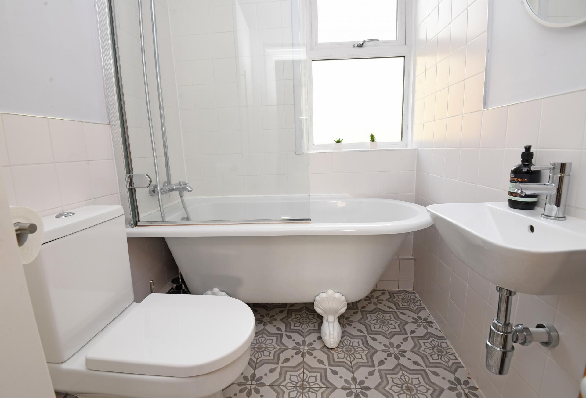 A modern white suite comprising low-flush WC, washbasin, and bath with shower above. Window to rear and heated towel rail.