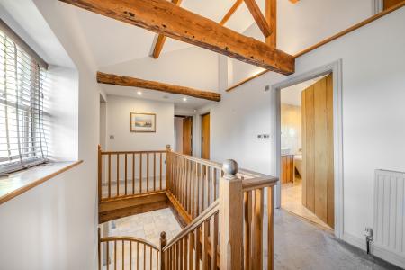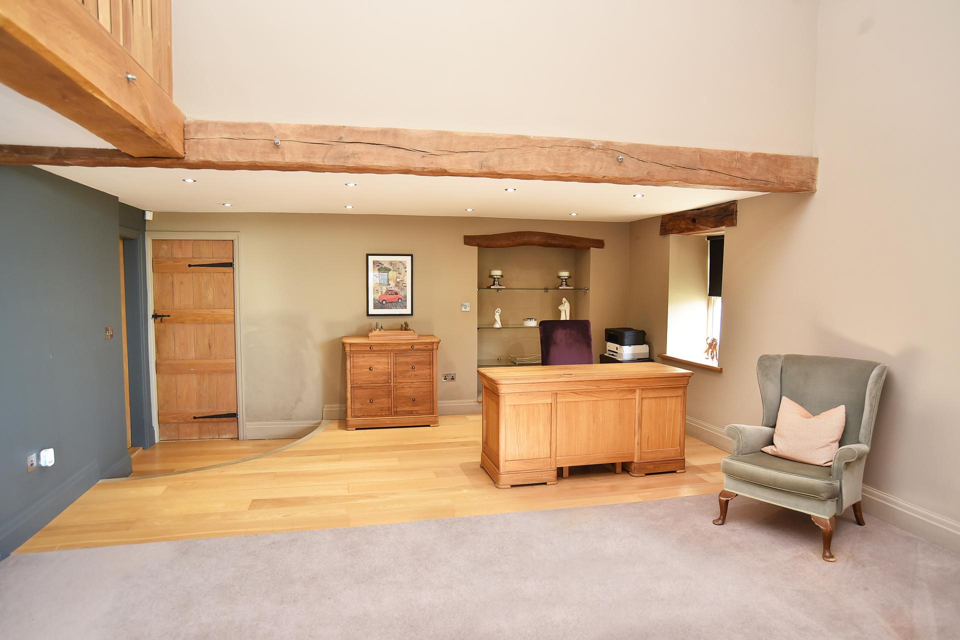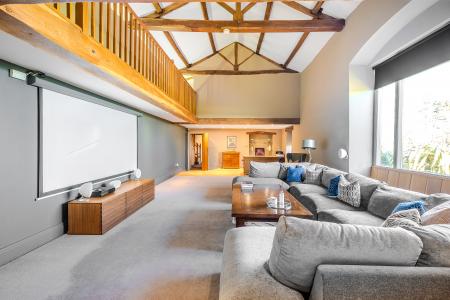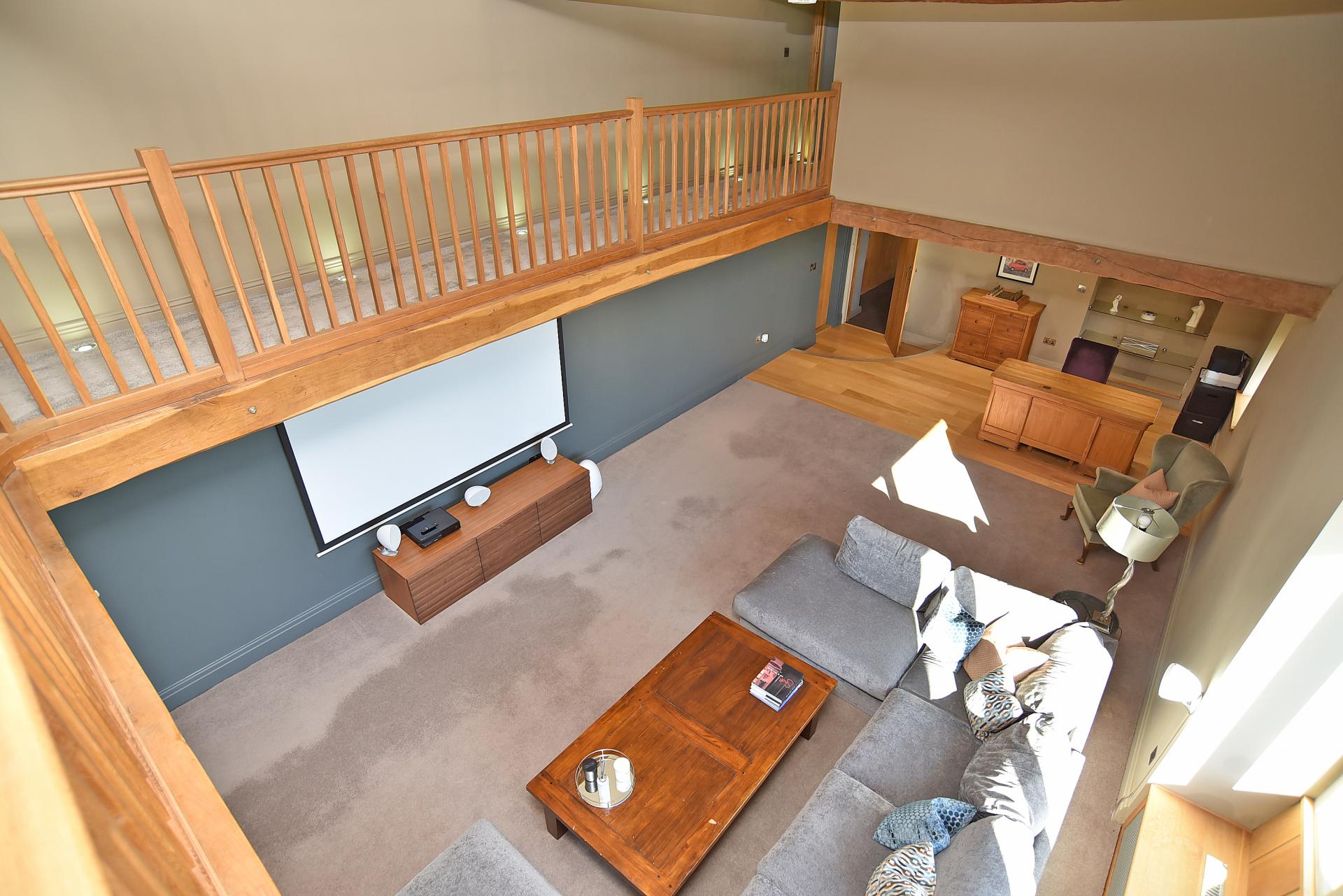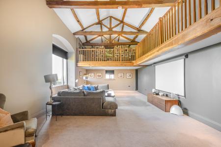 The principal reception rooms are equally impressive. The dual-aspect living room features vaulted ceilings, exposed beams and a mezzanine gallery above – an inspiring space for family gatherings or entertaining. A more intimate drawing room, with French doors onto the gardens, offers an additional retreat.