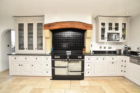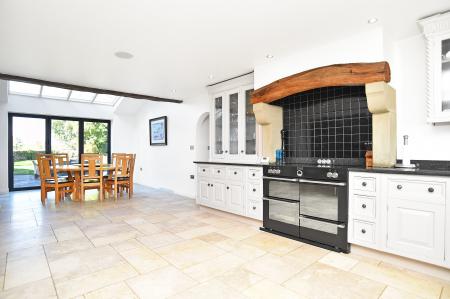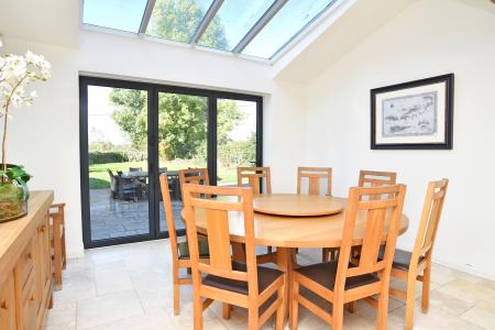 At its heart lies a spectacular open-plan dining kitchen with limestone flooring, handcrafted cabinetry, granite worktops and integrated appliances. The vaulted dining area is flooded with natural light and easily accommodates a family-sized table, while bi-folding doors create a seamless connection to the gardens. A practical utility room adjoins.