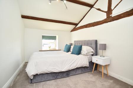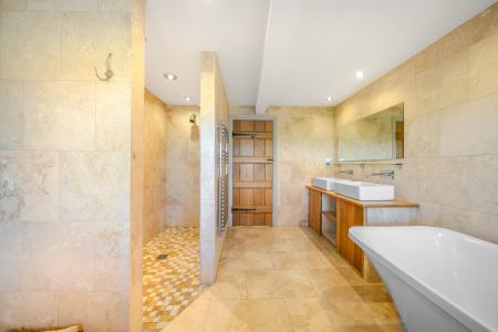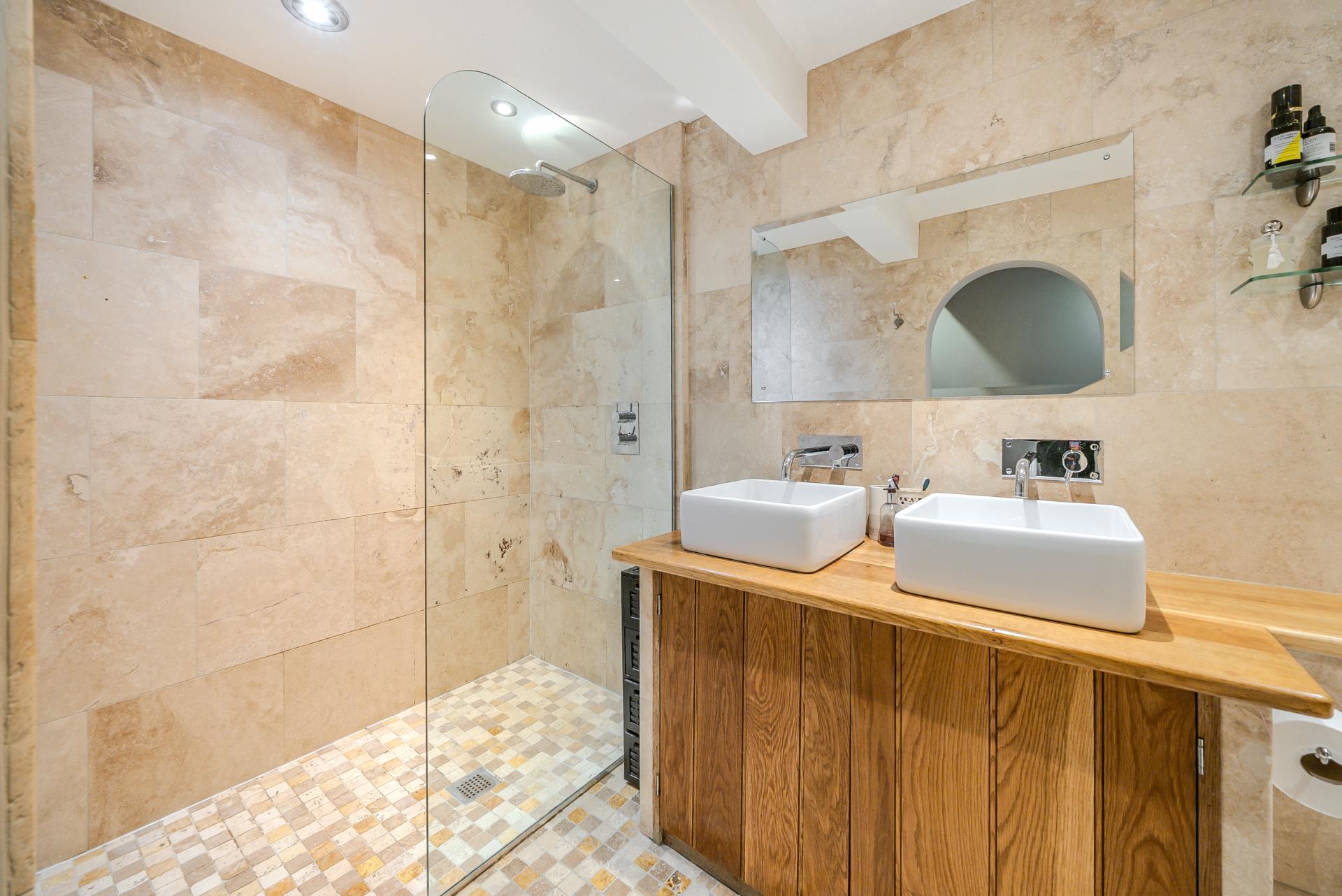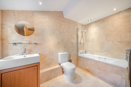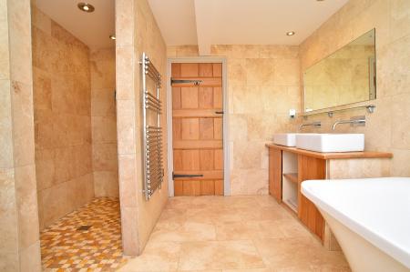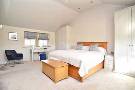 The principal bedroom is a stunning vaulted dual-aspect suite with a sleek en-suite shower room. Two further double bedrooms share a beautifully appointed travertine-tiled house bathroom, complete with freestanding roll-top bath. A fourth bedroom, comfortably sized for a double, provides additional flexibility.