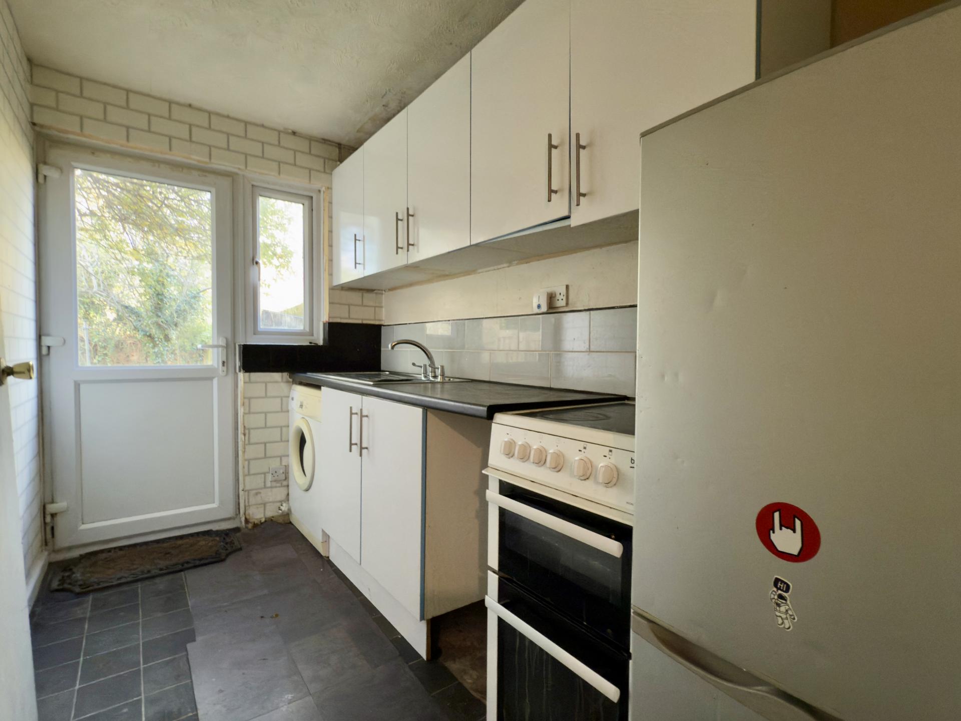 Fitted with a range of wall and base units. Plumbing and space for washing machine. Space for cooker and space for fridge freezer. Rear access door.