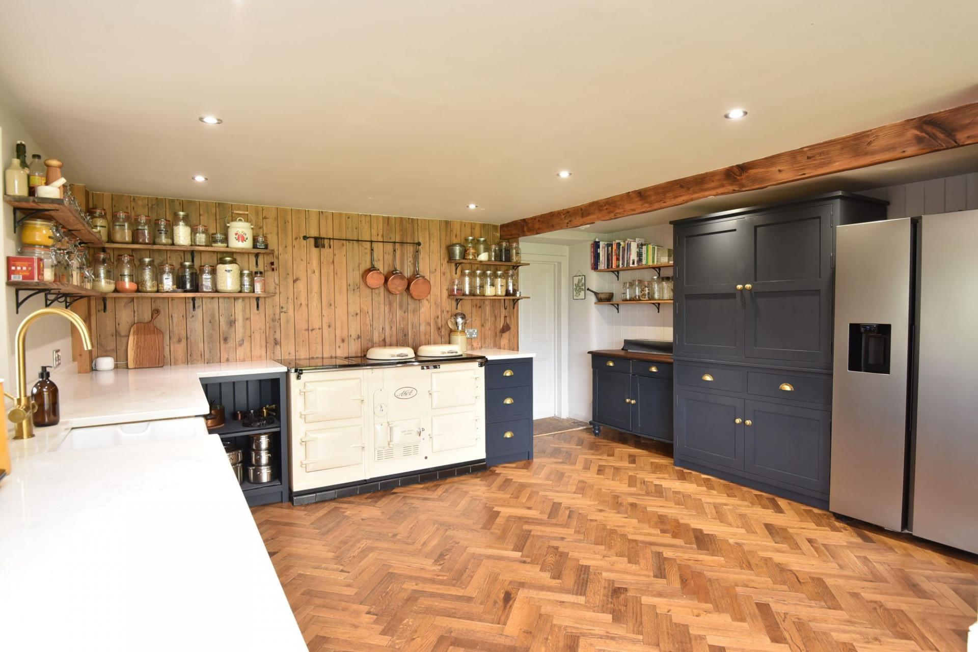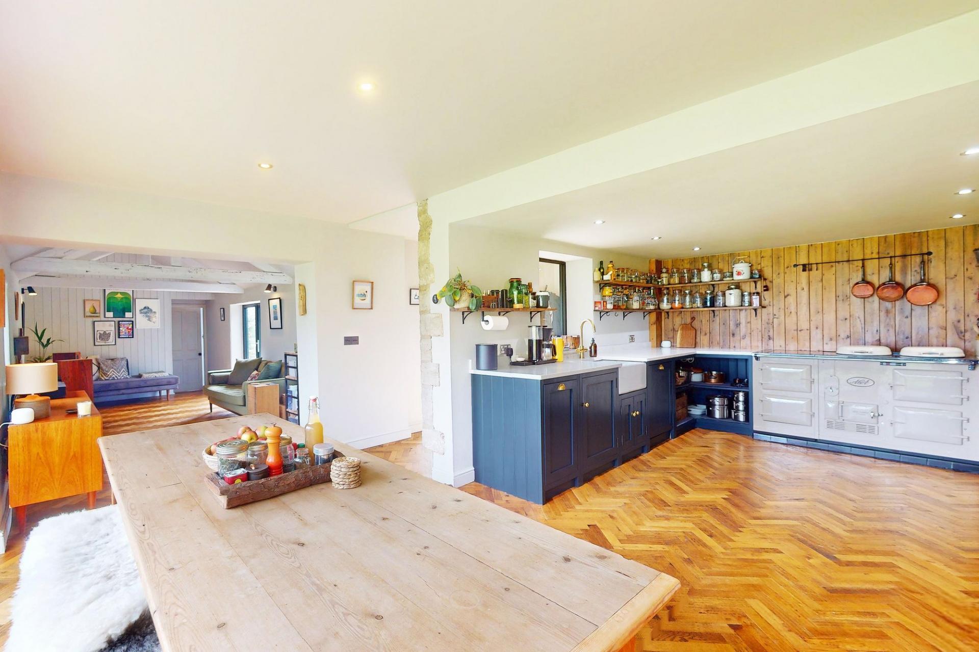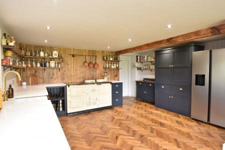 A particular feature of the property is the stunning L-shaped living kitchen, incorporating hand-painted kitchen units, an Aga range cooker, space for an American fridge / freezer, Belfast-style sink and quartz work surfaces.