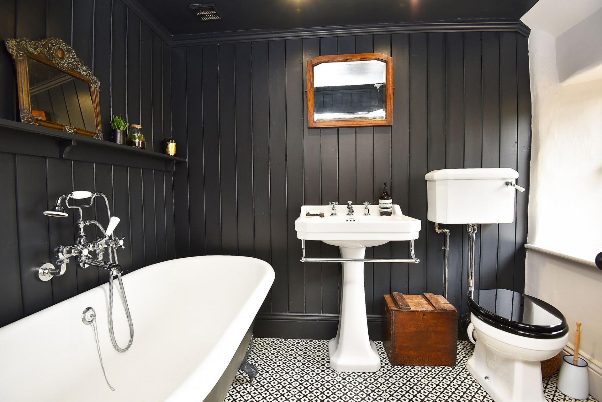 With painted wood-panelled walls. Roll-top bath, washbasin and WC.