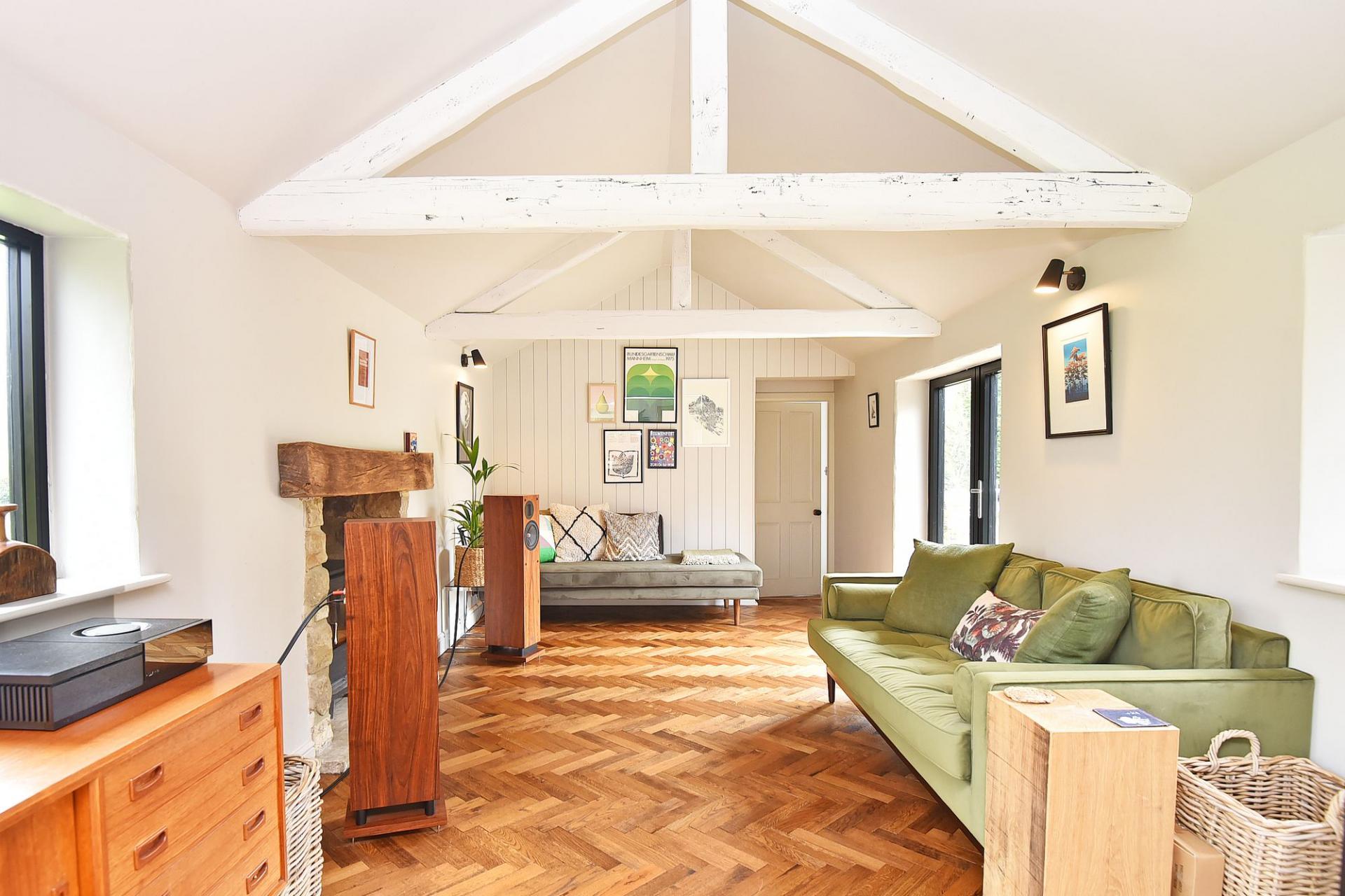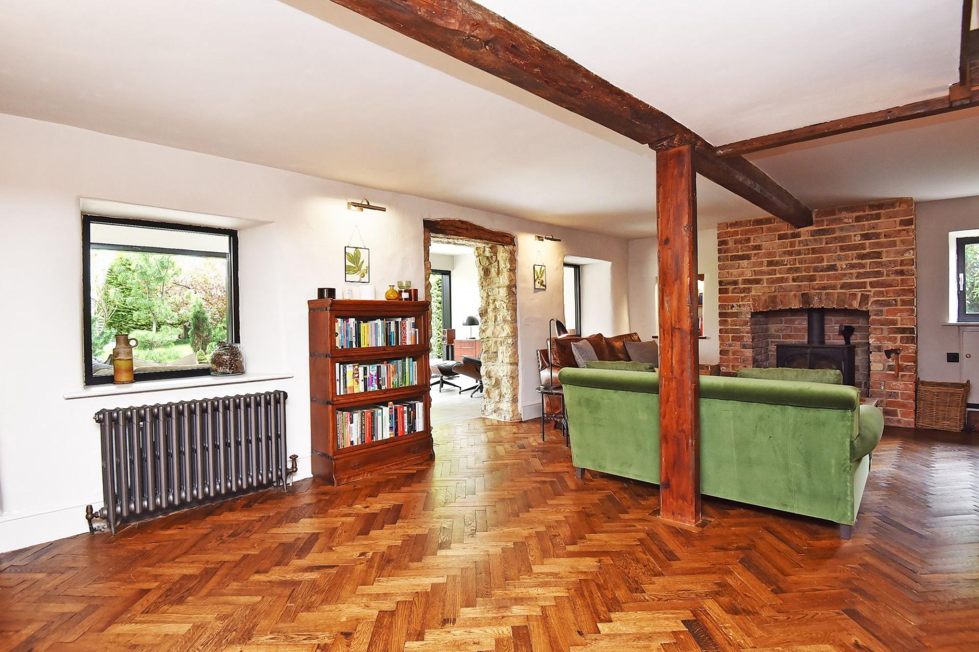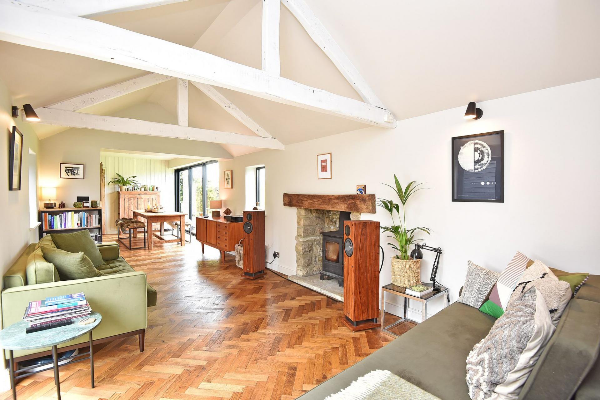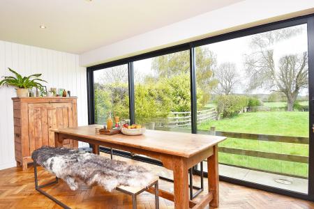 The dining area has delightful views over the adjoining countryside and opens to a sitting room with log-burner.