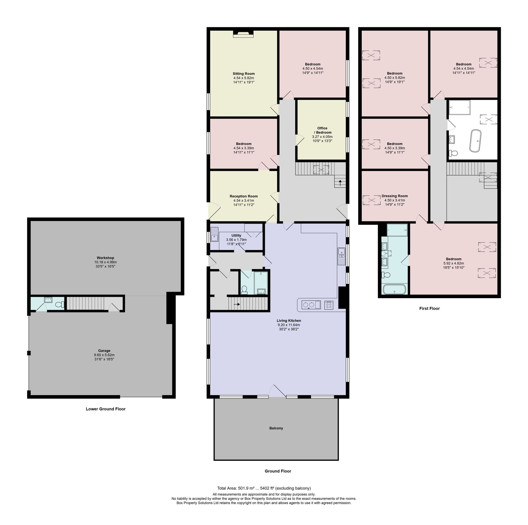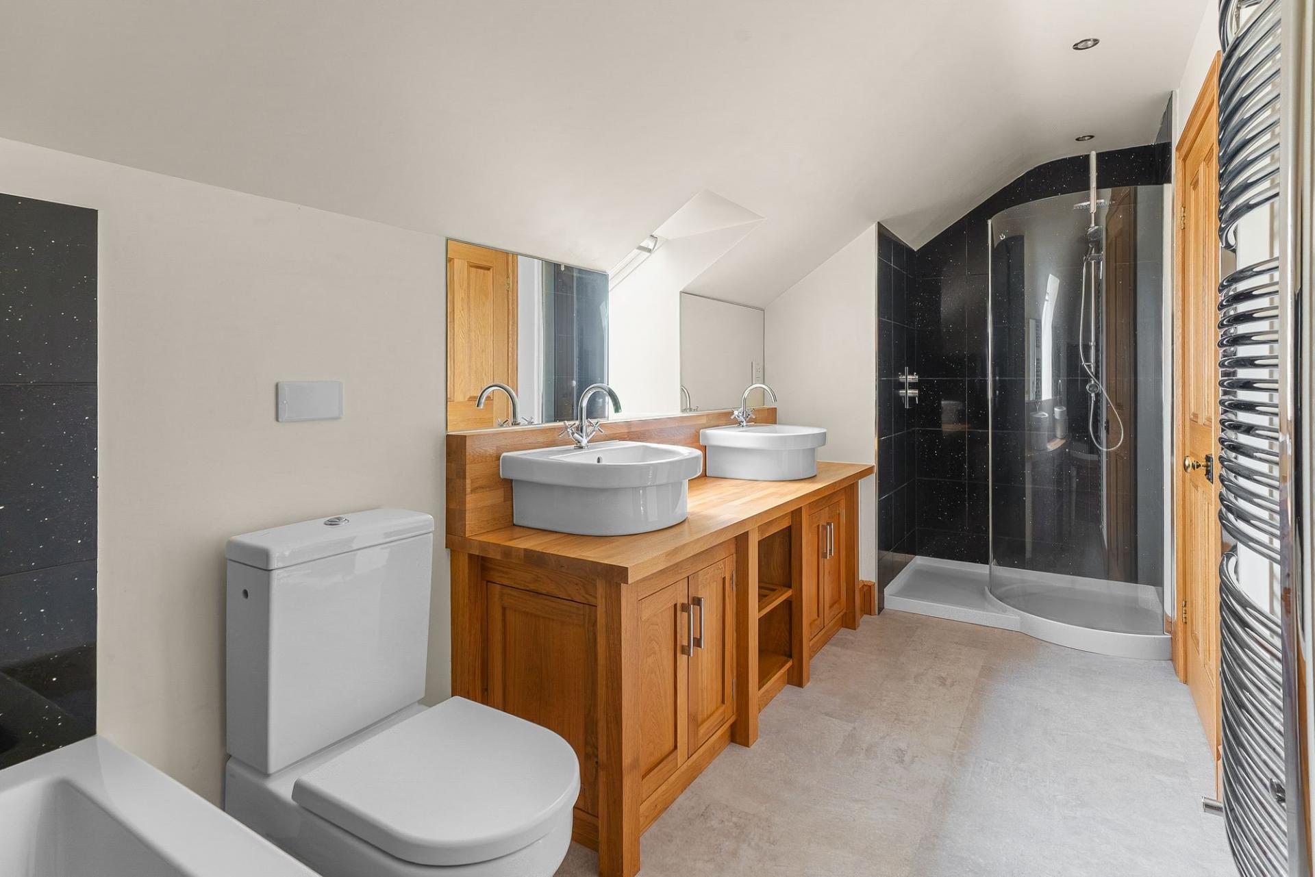 On the first floor there are four good-sized double bedrooms. The principal bedroom benefits from a spacious en-suite bathroom fitted with bath, separate shower, WC and twin basins, together with a large dressing room which could alternatively be used as a fifth first-floor double bedroom if required. There is also a stylish house bathroom fitted with a free-standing bath and separate shower.