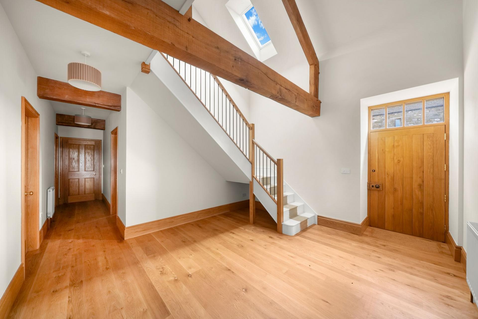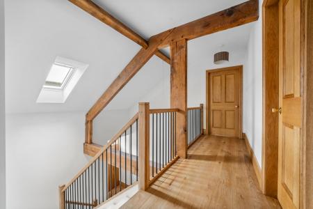 There is also a large separate sitting room featuring a woodburning stove together with fitted cabinets and shelving. In addition, there are four further rooms on the ground floor which can be used flexibly as reception rooms, bedrooms or office spaces depending on the buyer’s requirements. This layout offers excellent potential for ground-floor bedroom accommodation if desired. A large reception hallway with vaulted ceiling and impressive oak staircase leads to the first floor. There is also a useful utility room and a ground-floor shower room.