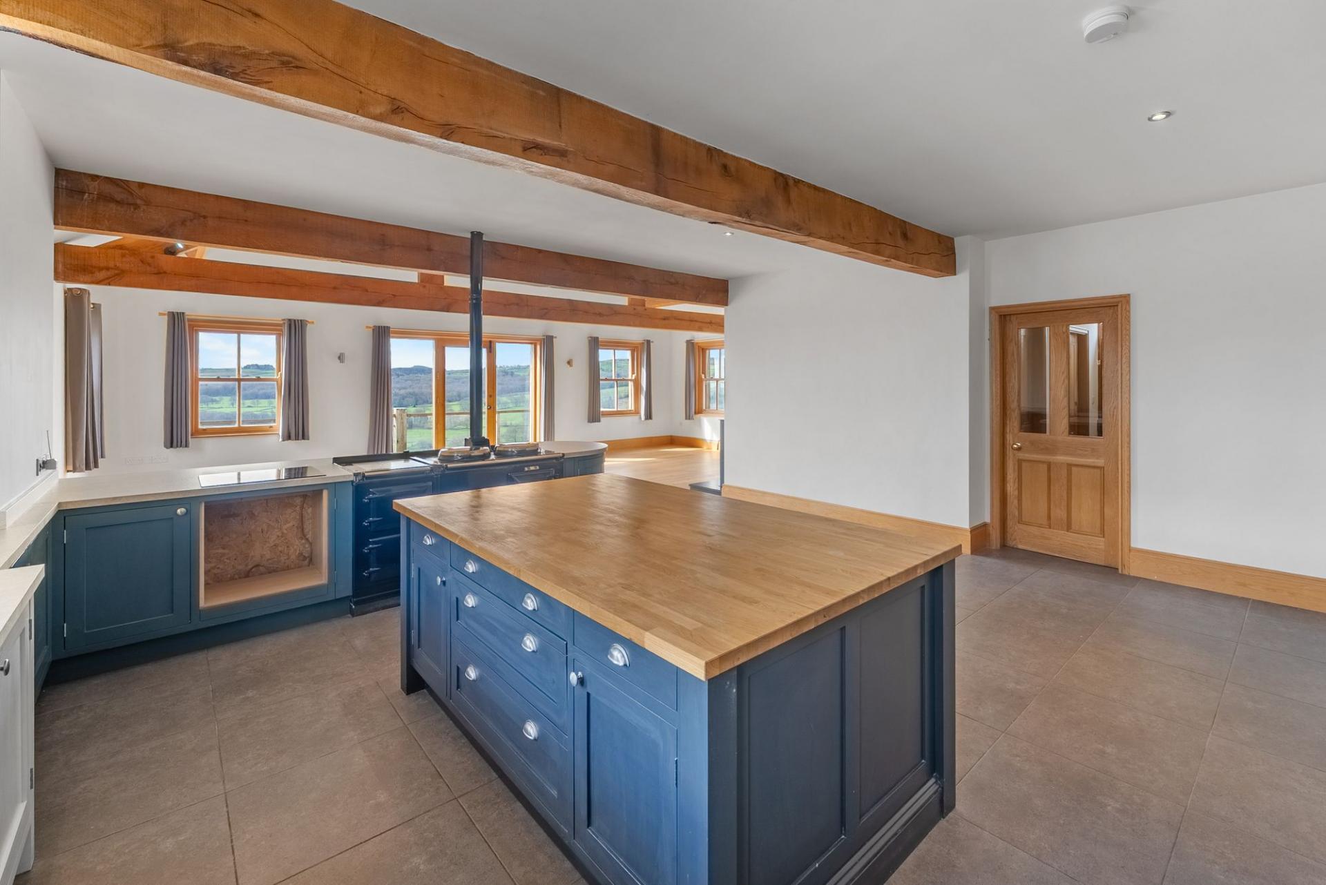 The impressive ground-floor accommodation centres around a stunning open-plan kitchen and living area providing generous sitting and dining spaces with vaulted ceilings, exposed oak beams and glazed doors leading directly onto the sun terrace. The kitchen is fitted with a range of stylish units with worktops, central island and breakfast bar, together with an oil-fired AGA.