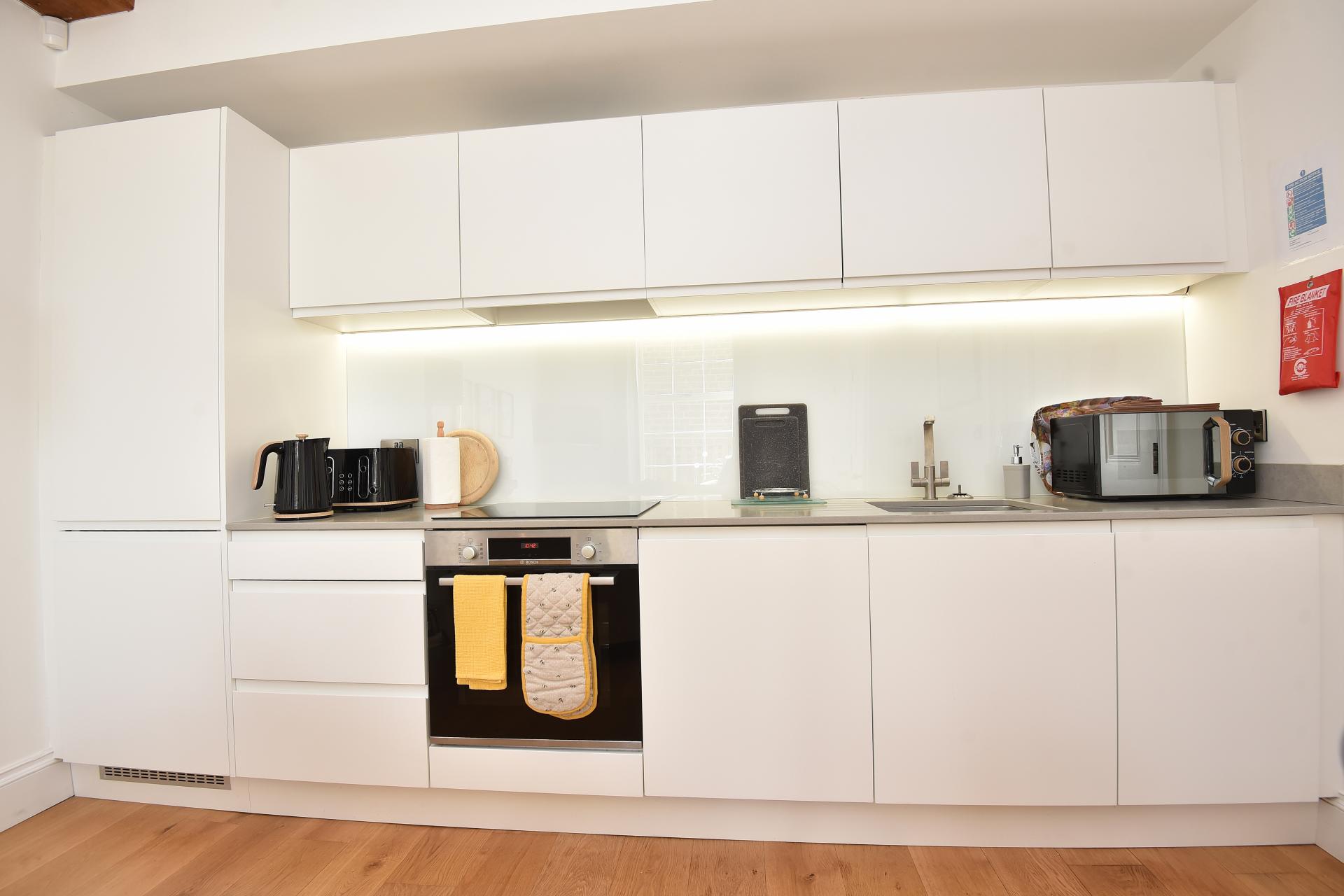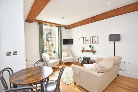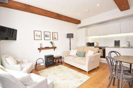 A delightful open-plan living space with sitting and dining areas and a modern fitted kitchen with a range of stylish units. Electric hob, integrated oven, fridge / freezer and dishwasher.