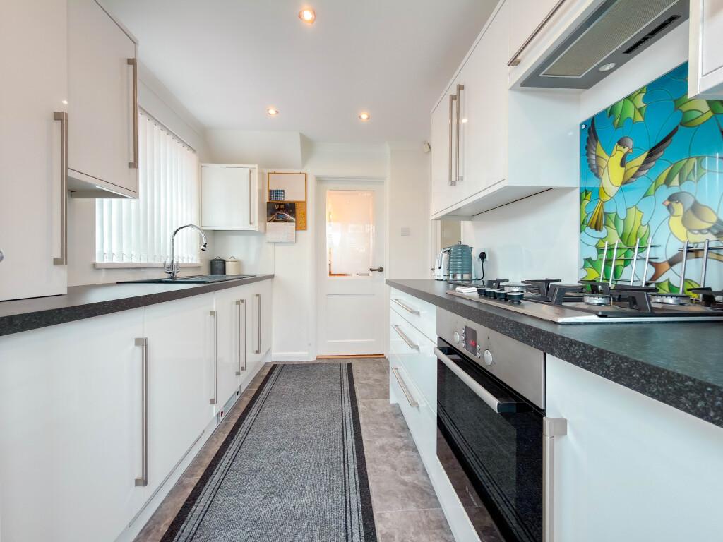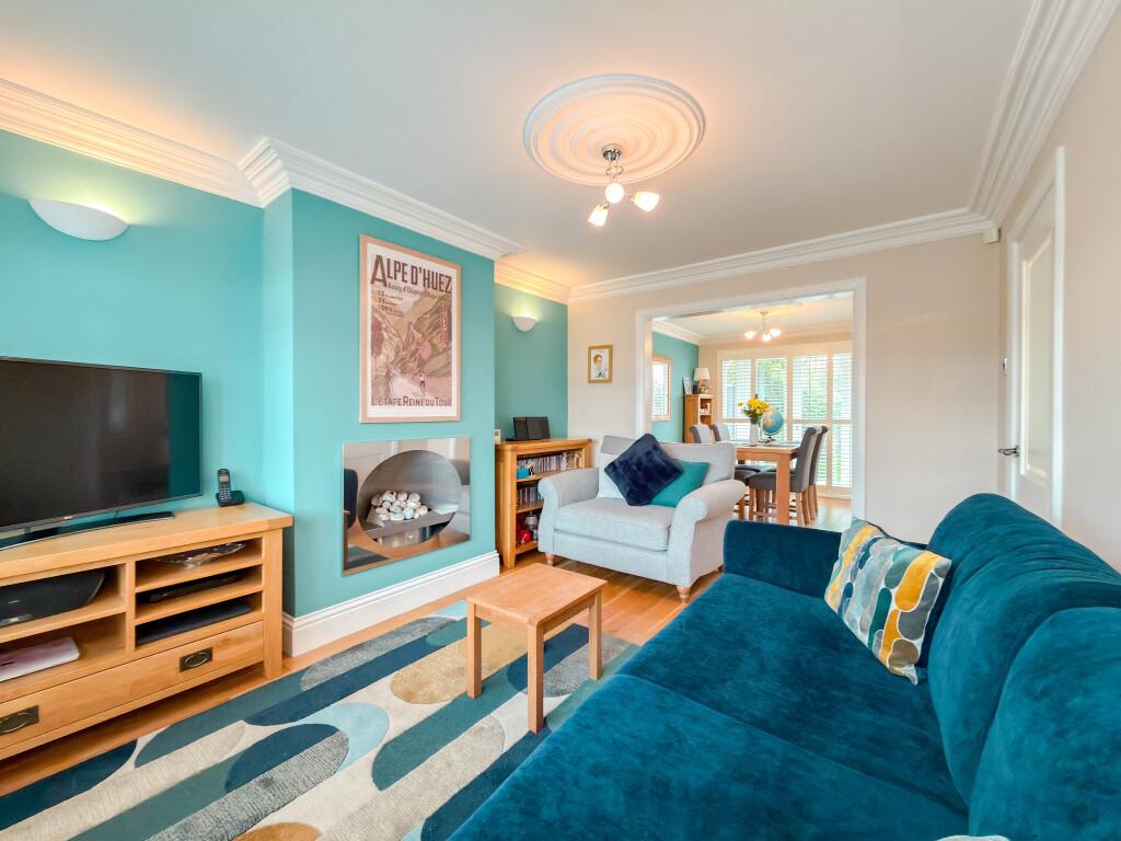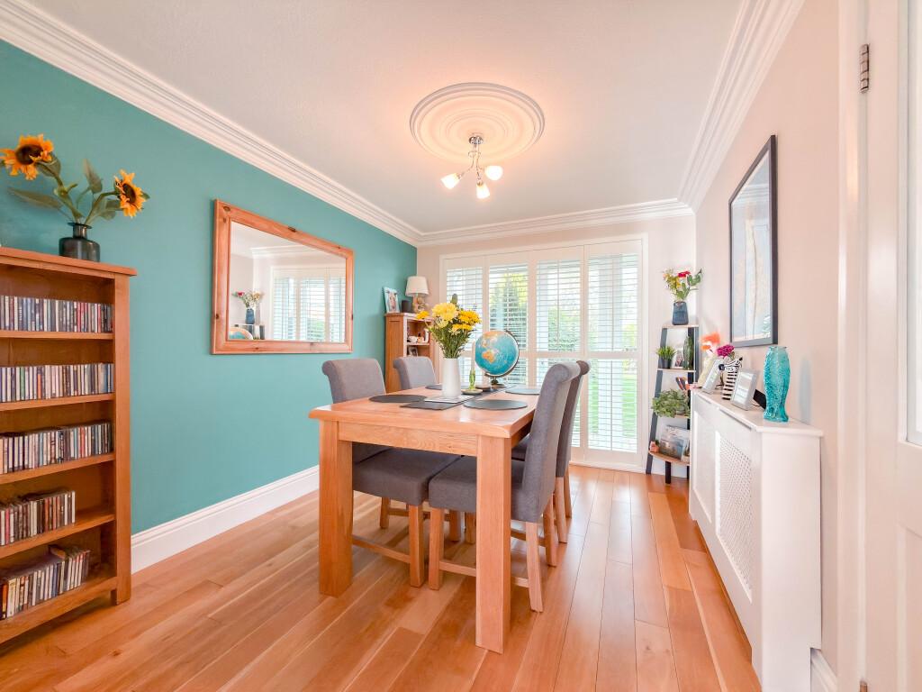 The dining room enjoys pleasant views over the rear garden and provides direct access into the refitted kitchen. The kitchen has been thoughtfully upgraded with a range of white high gloss base and wall units, integrated cookware and ample worktop space, delivering a sleek and practical cooking environment.