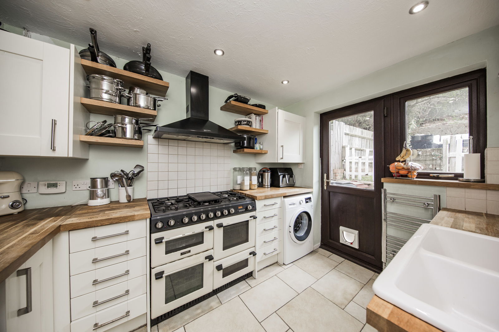 KITCHEN: Double glazed window and double glazed door leading to the garden. Range of cream fronted matching wall and base cupboards. Wood block worktop with space for range-style cooker, washing machine and dishwasher. Inset twin butler sink. Built-in wine cooler. Chrome heated towel rail. Inset spotlights. Tiled floor.