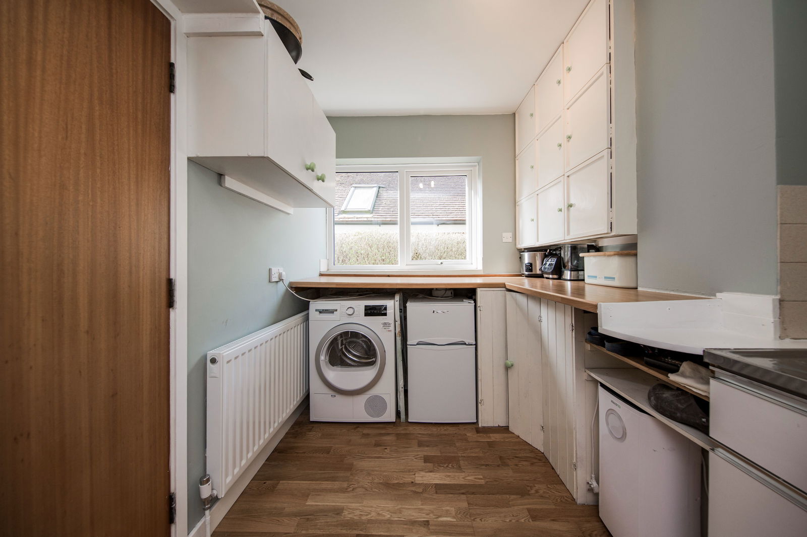 Wood effect worktops with cupboards under. Stainless steel sink with cupboards under. Space for washing machine. Door to integral garage. Radiator.