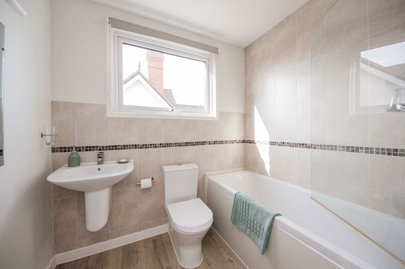 Triple glazed window. White suite comprising panel enclosed bath with shower over. WC. Wash basin. Part-tiled walls. Wood effect flooring. Radiator.