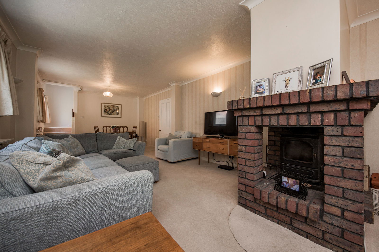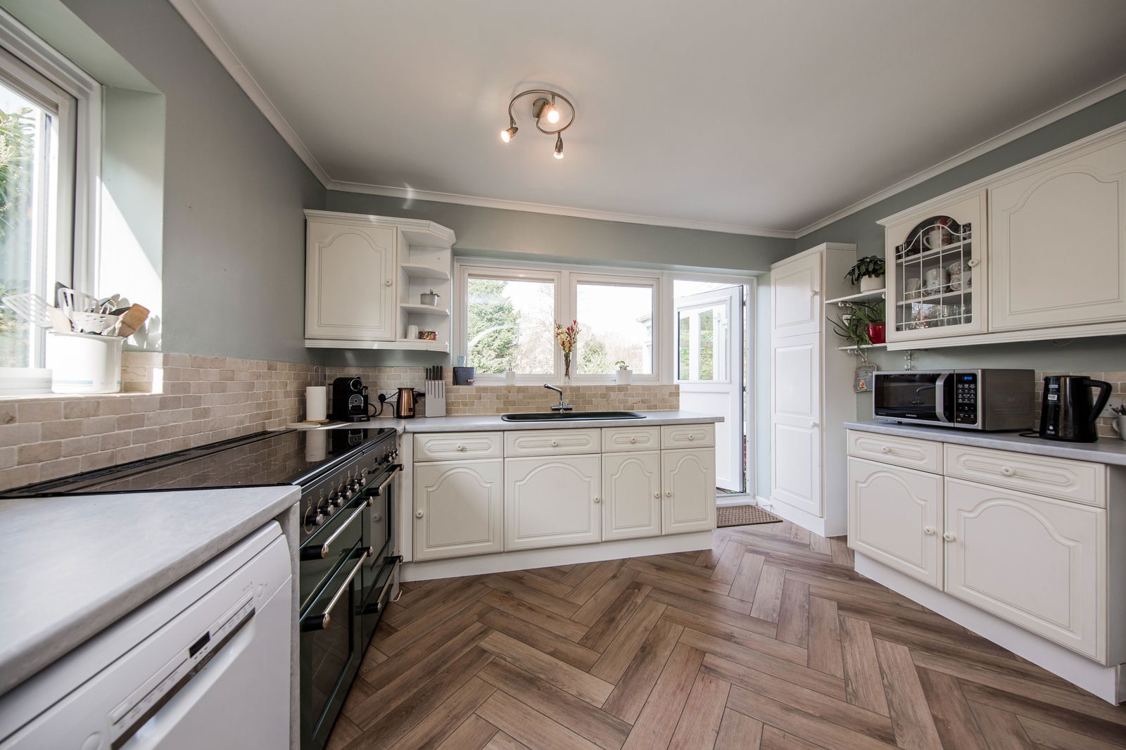 Kitchen Area: Dual aspect with triple glazed windows and door to the rear garden. Range of matching wall and base cupboards. Laminate worktop with inset one and a half bowl sink and tiled upstand. Space for dishwasher. Floor mounted oil-fired boiler. Coved ceiling. Herringbone wood effect flooring. Archway to: