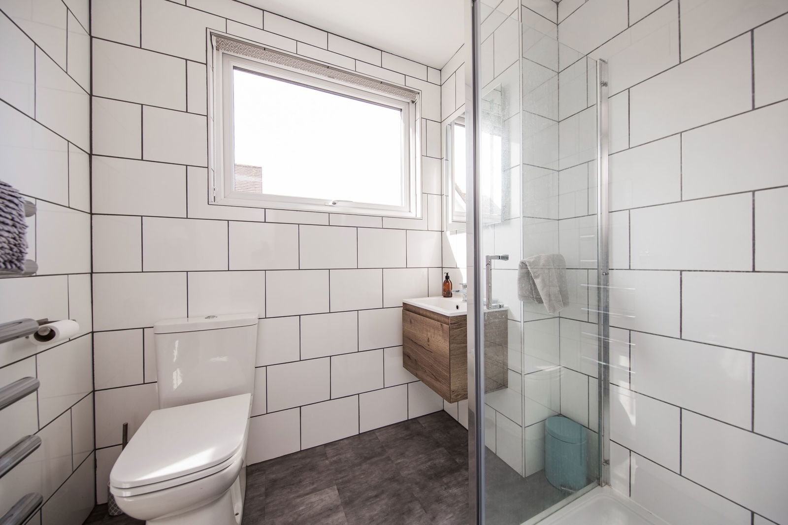 Triple glazed window. Shower cubicle with thermostatic shower featuring a drencher head and hand held shower. WC. Wash basin with cupboard under. Tiled walls. Chrome heated towel rail.