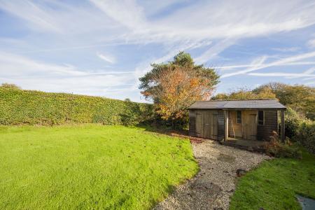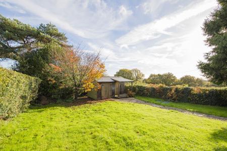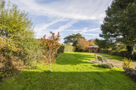OUTSIDE: There is a lawned garden with brick pathway to the front door and driveway providing off street parking. The REAR garden is hedge enclosed and mainly laid to lawn with a large paved patio area and timber outbuilding comprising storage shed and office/games room.