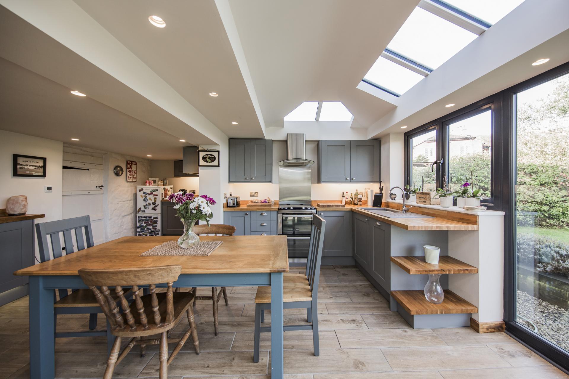 KITCHEN/DINER: Double glazed windows overlooking the rear garden and double glazed French doors. Range of grey fronted matching wall and base cupboards. Wood block worktops and breakfast bar. Inset sink. Space for cooker with stainless steel upstand and extractor hood. Integrated dishwasher and washing machine. Wood effect tiled floor. Wood burning stove. Inset spotlights. Roof lantern. Under floor heating.