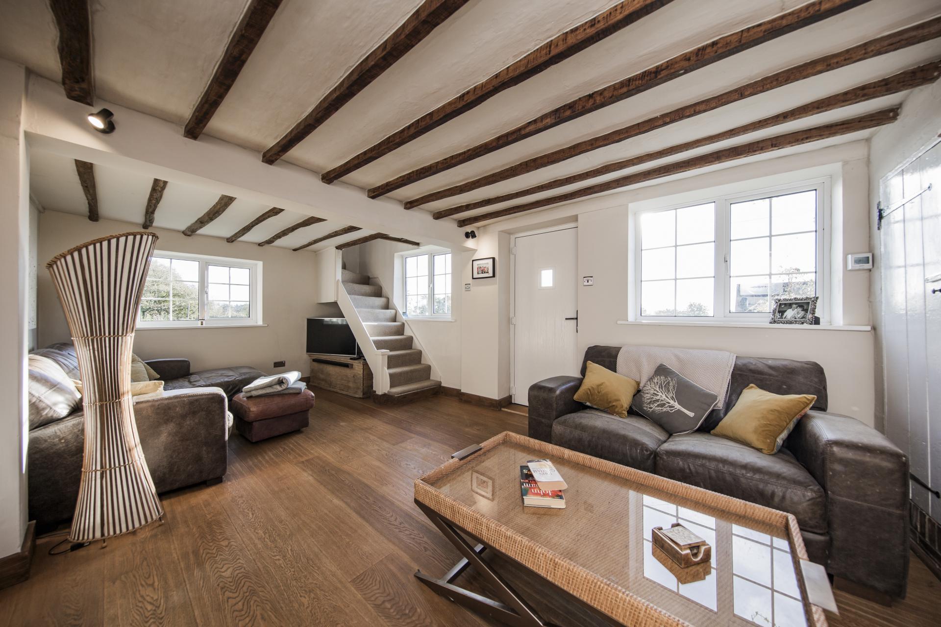 SITTING ROOM: A spacious double aspect room with windows overlooking the front garden and with far-reaching views to the south coast. Beamed ceiling. Inglenook style fireplace with wood burning stove and built in cupboard to the side. Oak flooring. Under floor heating.