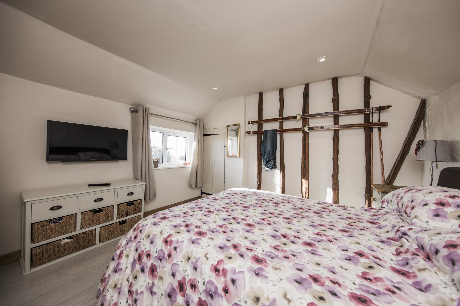 BEDROOM ONE: Double glazed window with stunning far-reaching views to the south coast. Beamed wall. Built-in cupboard. Electric underfloor heating.