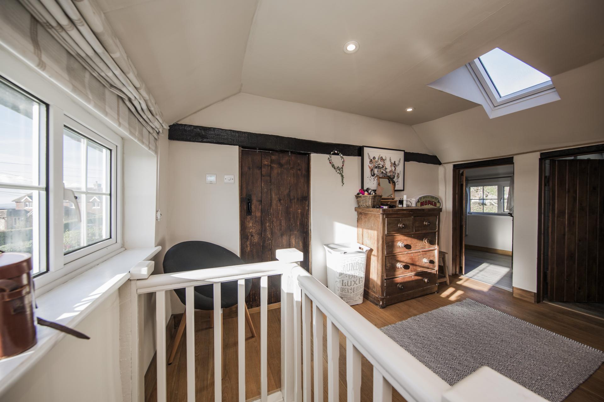 FIRST FLOOR LANDING: Velux double glazed window with stunning panoramic view to the south coast. Access to the loft space. Airing cupboard housing the hot water cylinder with slatted shelving above. Engineered oak flooring.