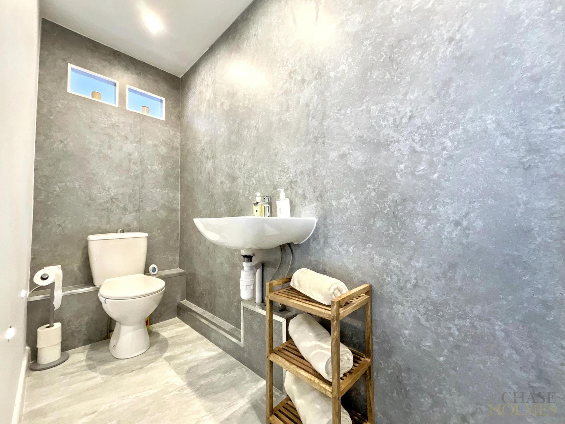 Upon entering, you are welcomed into a bright and inviting hallway that leads to a spacious living area, with french doors to garden perfect for both relaxing evenings and entertaining guests. The contemporary kitchen is thoughtfully designed, featuring sleek cabinetry and a stylish breakfast bar that provides a sociable space for morning coffee or casual dining. A convenient downstairs WC adds to the practicality of the ground floor layout.