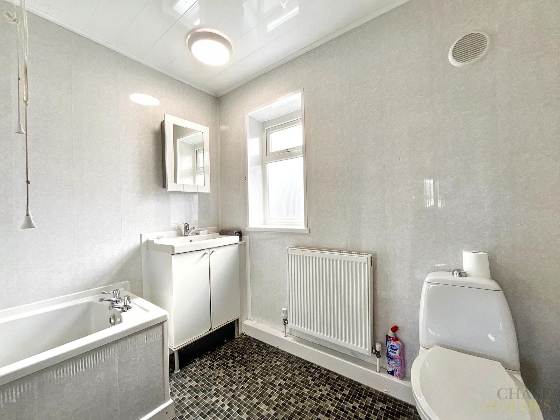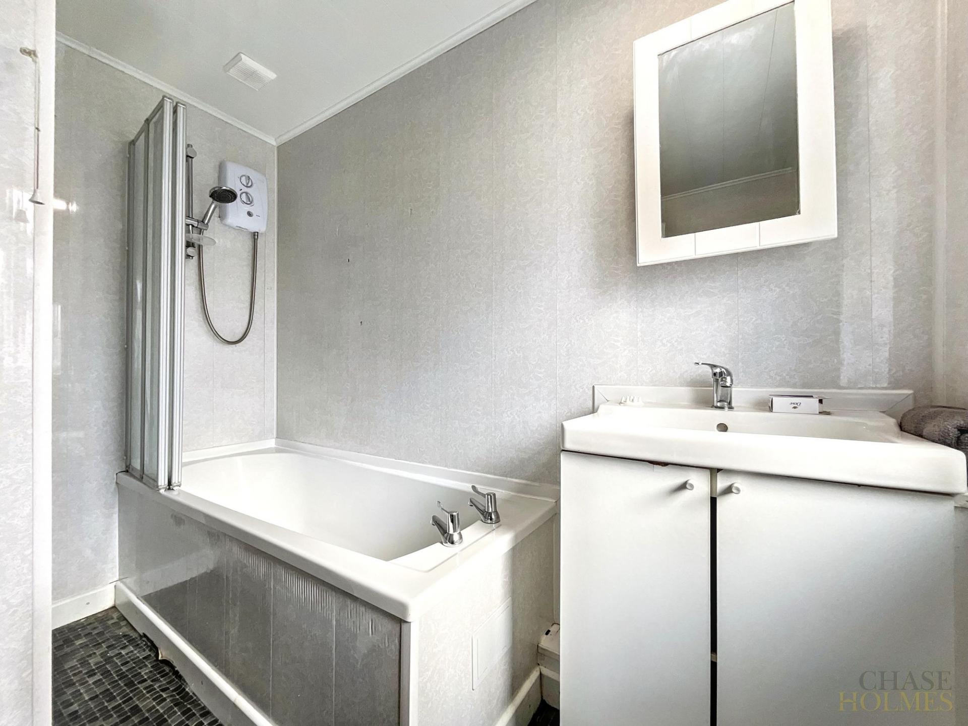 Each of the three bedrooms is well-proportioned, allowing for flexible use as sleeping quarters, a home office, or nursery. The modern bathroom features a stylish suite with a shower over the bath, providing both comfort and convenience for busy households.