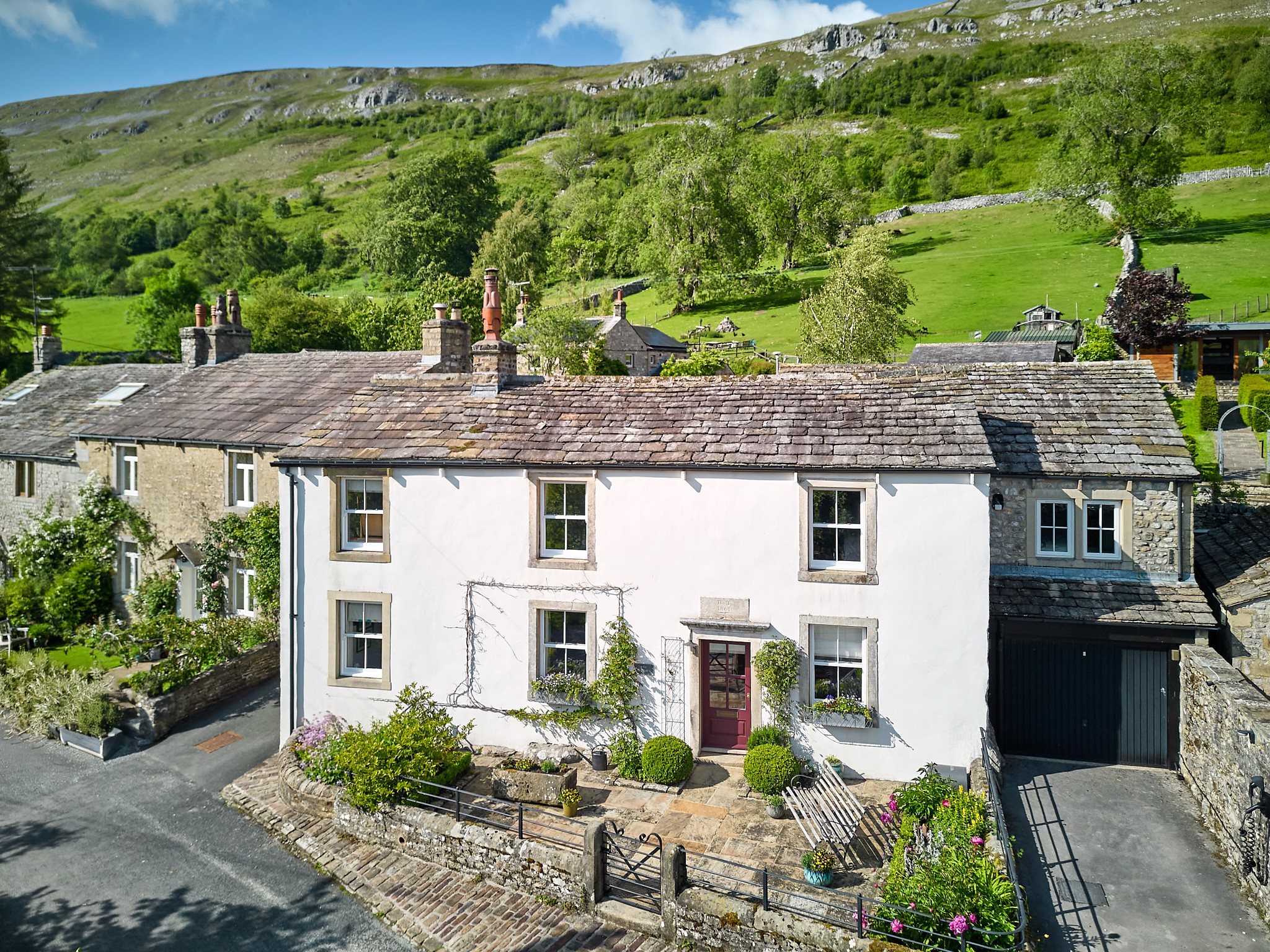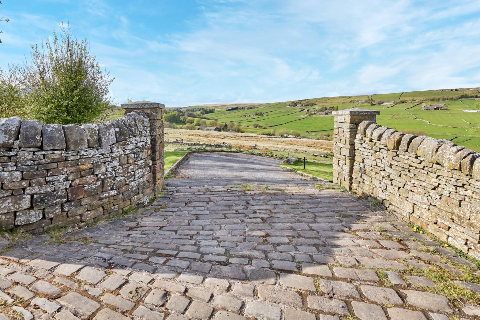 - Sweeping Driveway with Traditional Dry Stone Boundary Leading to Courtyard and Manicured Gardens
