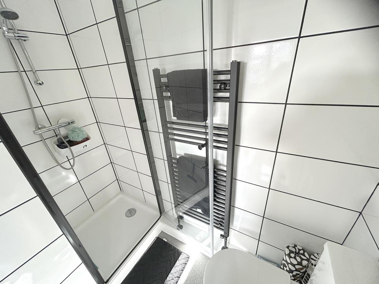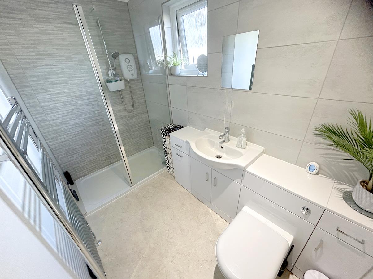 En Suite Shower Room - With a white fitted suite with a low-level w.c, pedestal wash hand basin with mixer tap over and a shower cubicle housing a thermostatic shower. There is a ladder style towel rail, an extractor, vinyl flooring, shaving point, attractive white tiling to the walls and an obscure glazed window to the side aspect.
